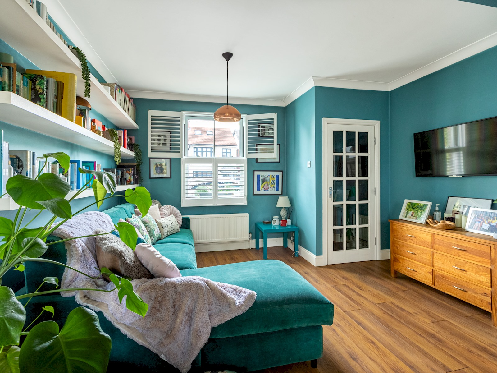 Living Room: Warm, colourful and inviting space with a plush cosy sofa, a flat-screen TV and a dining table for four