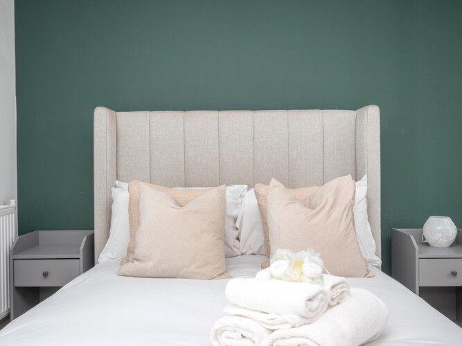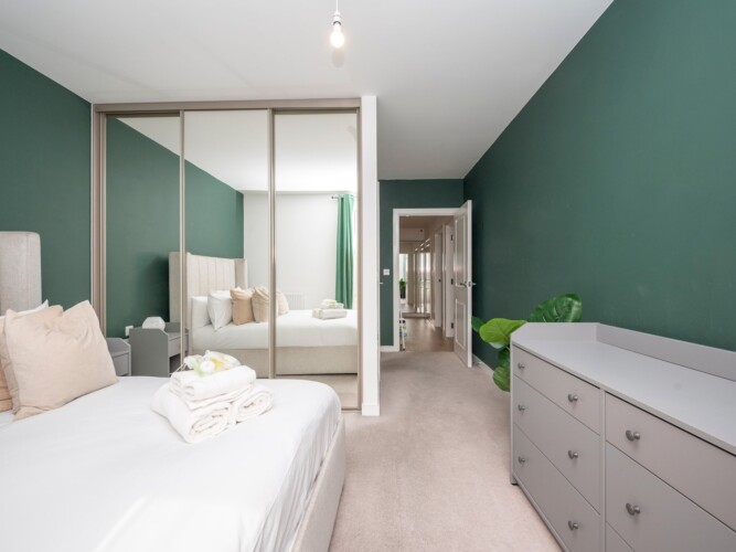 The modern furnishings continue through to the Master bedroom, where there is an inviting (UK) Double-sized bed, bedside tables and bedside lamp. There is a floor to ceiling window with curtains which allow guests to control the light into the room. There is a large wardrobe, with mirror doors, for guest belongings along with a large chest of drawers, for folded items. This bedroom is a calm and inviting space with the added benefit of an en-suite shower room with shower cubicle, WC, basin and over-basin mirrors.
