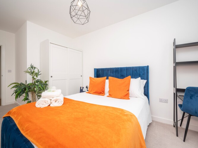Back via the entrance hall, is the second bedroom. This more vibrant room with blue and orange colour palette has a (UK) Double-sized bed, ceiling light, bookcase and a small desk and fabric chair for guests choosing to work or study during their stay.