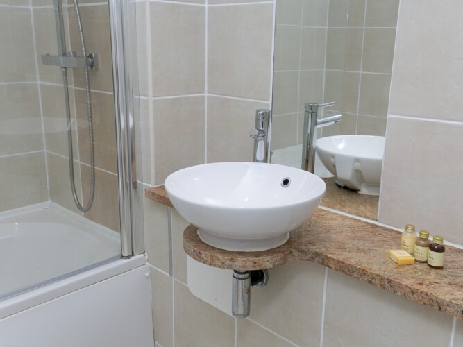 Finally, the contemporary bathroom has a shower over the full sized bath. and a stylish sink and vanity area.