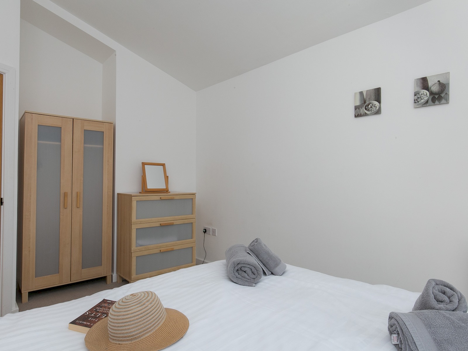 The king size master bedroom also has a large floor length window. This room has plenty of storage for your belongings in the form of a wardrobe, a chest of drawers, and bedside cabinets.