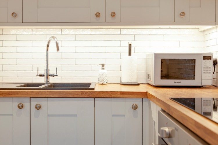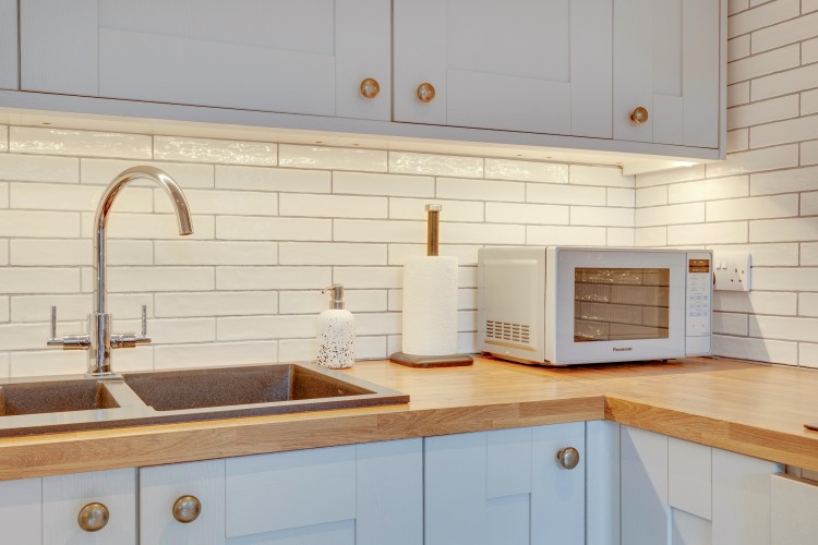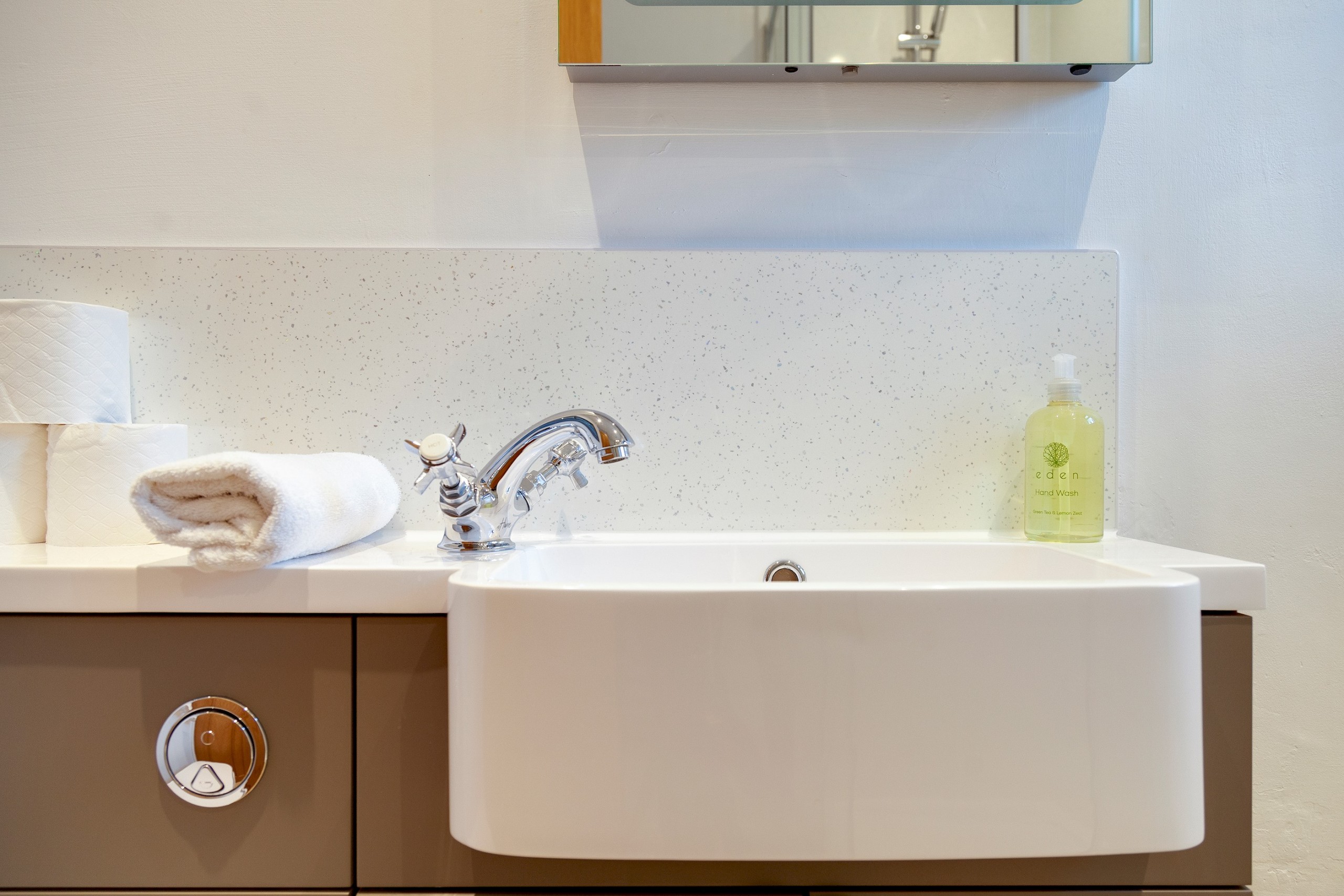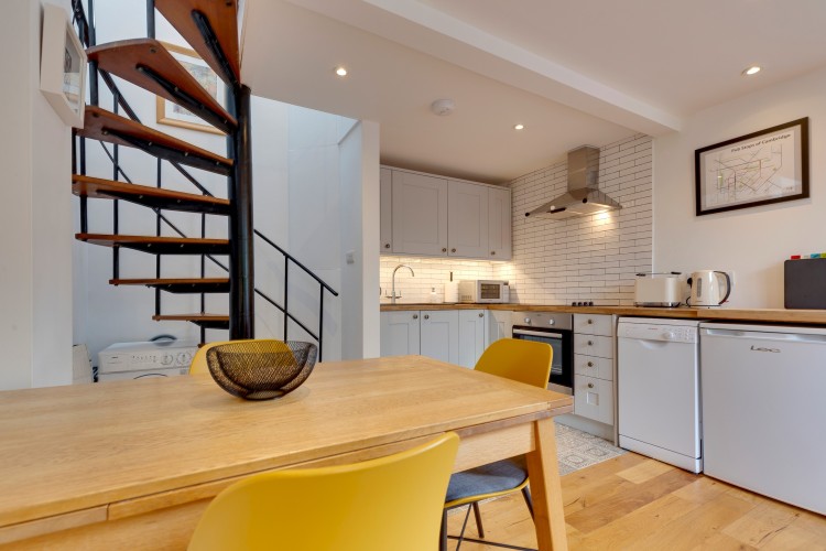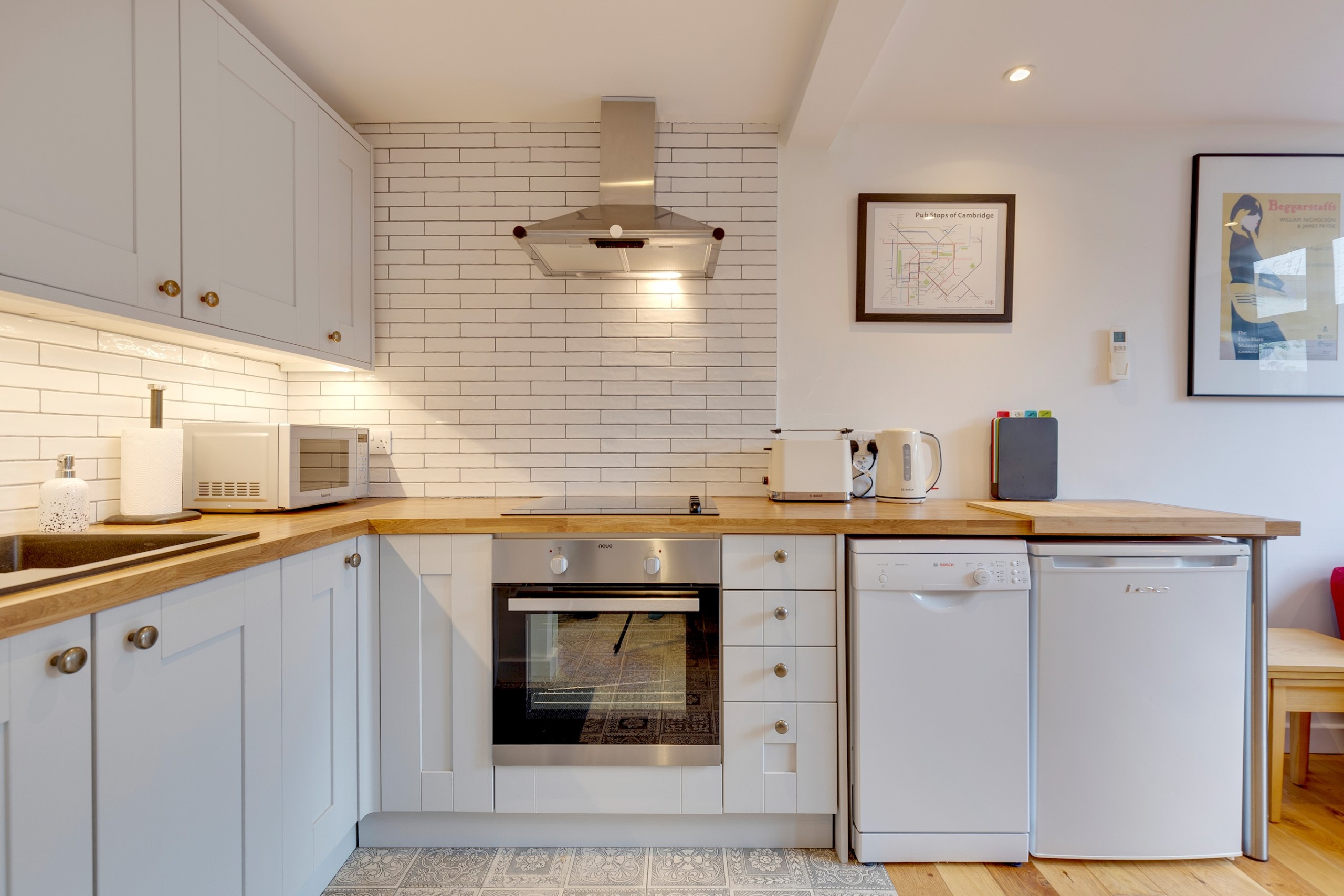 The modern kitchen is generously sized, and fully equipped for home dining. Use of appliances include an oven, electric hob, small fridge-freezer and dishwasher. Smaller appliances include a microwave, toaster, kettle, with some condiments provided. There is also a washing machine available for personal use.