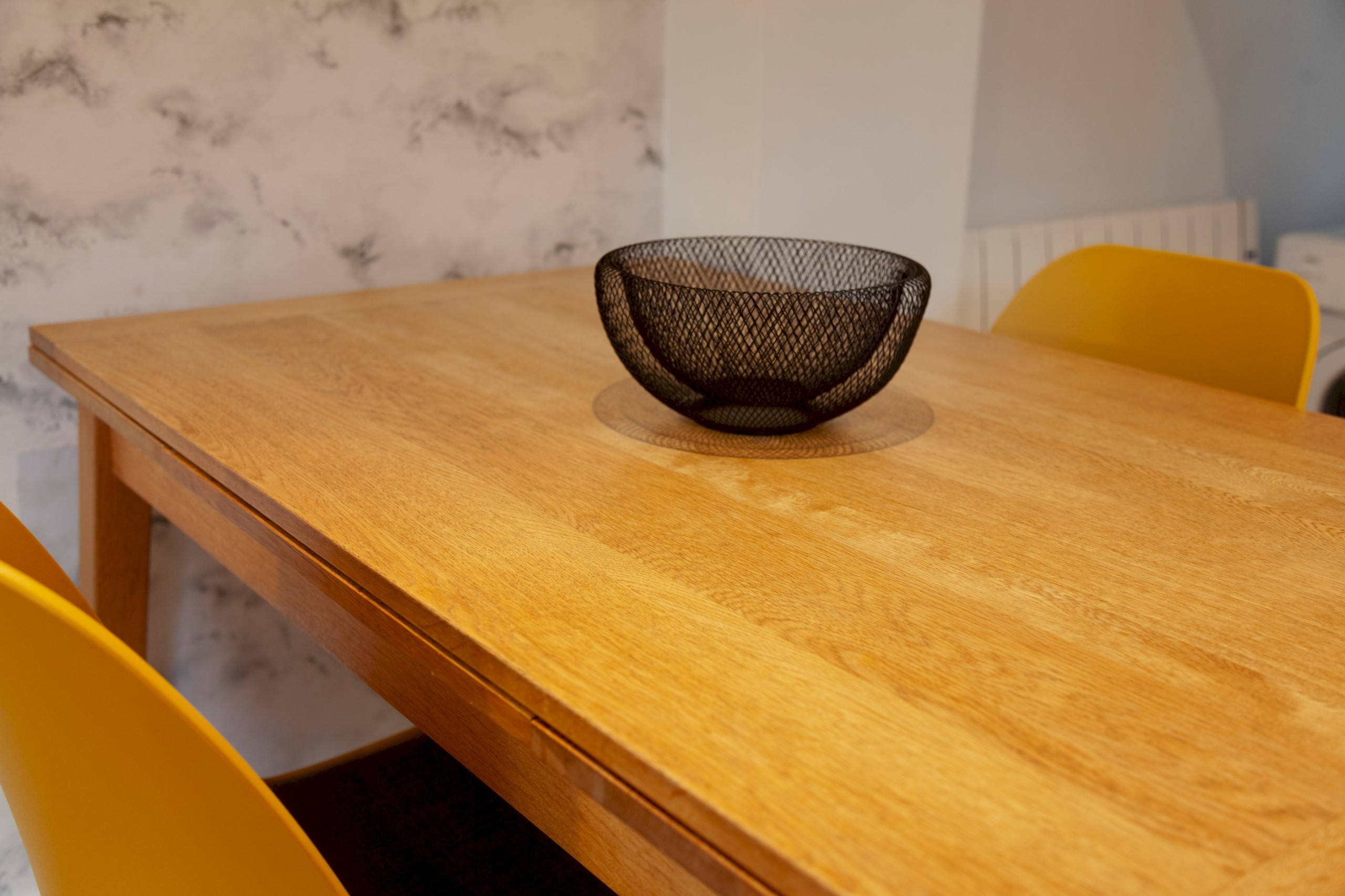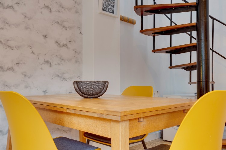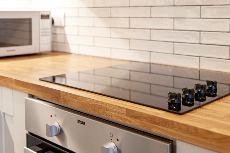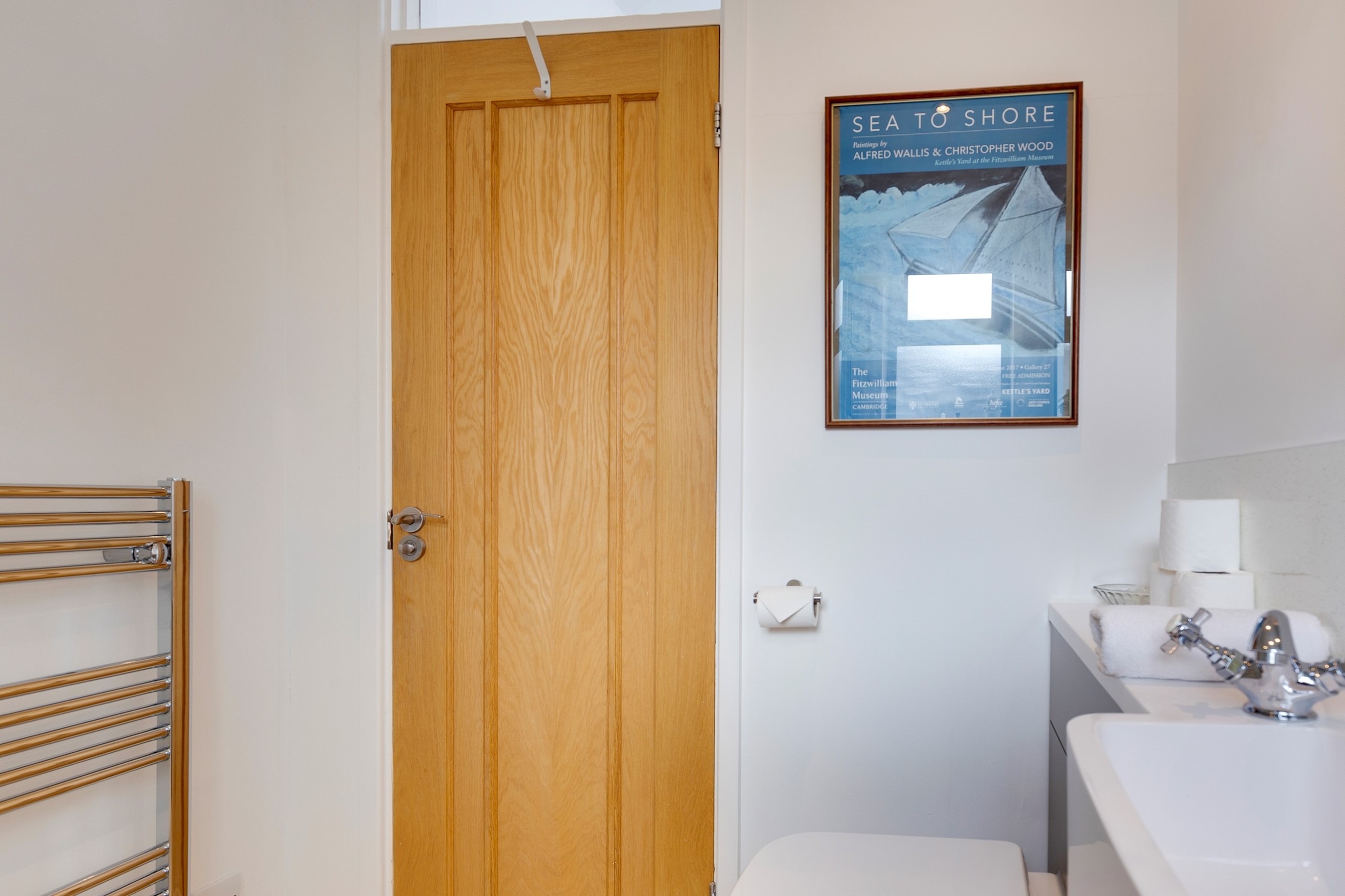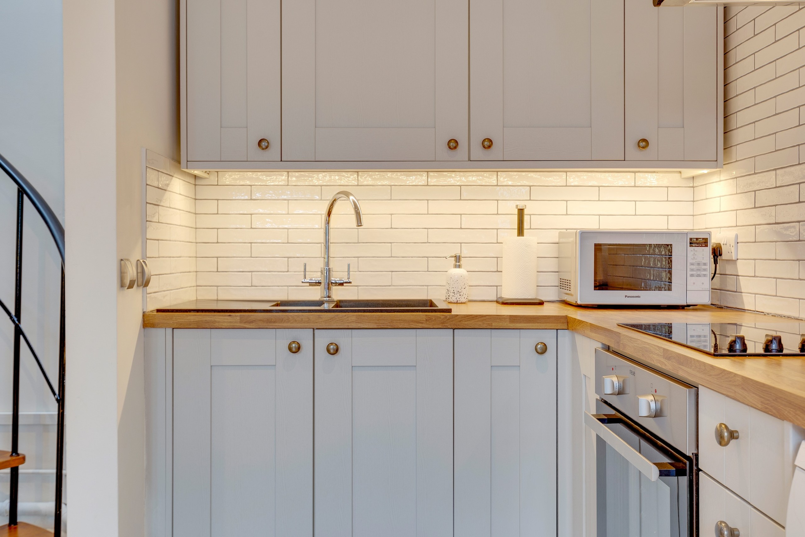 The modern kitchen is generously sized, and fully equipped for home dining. Use of appliances include an oven, electric hob, small fridge-freezer and dishwasher. Smaller appliances include a microwave, toaster, kettle, with some condiments provided. There is also a washing machine available for personal use.