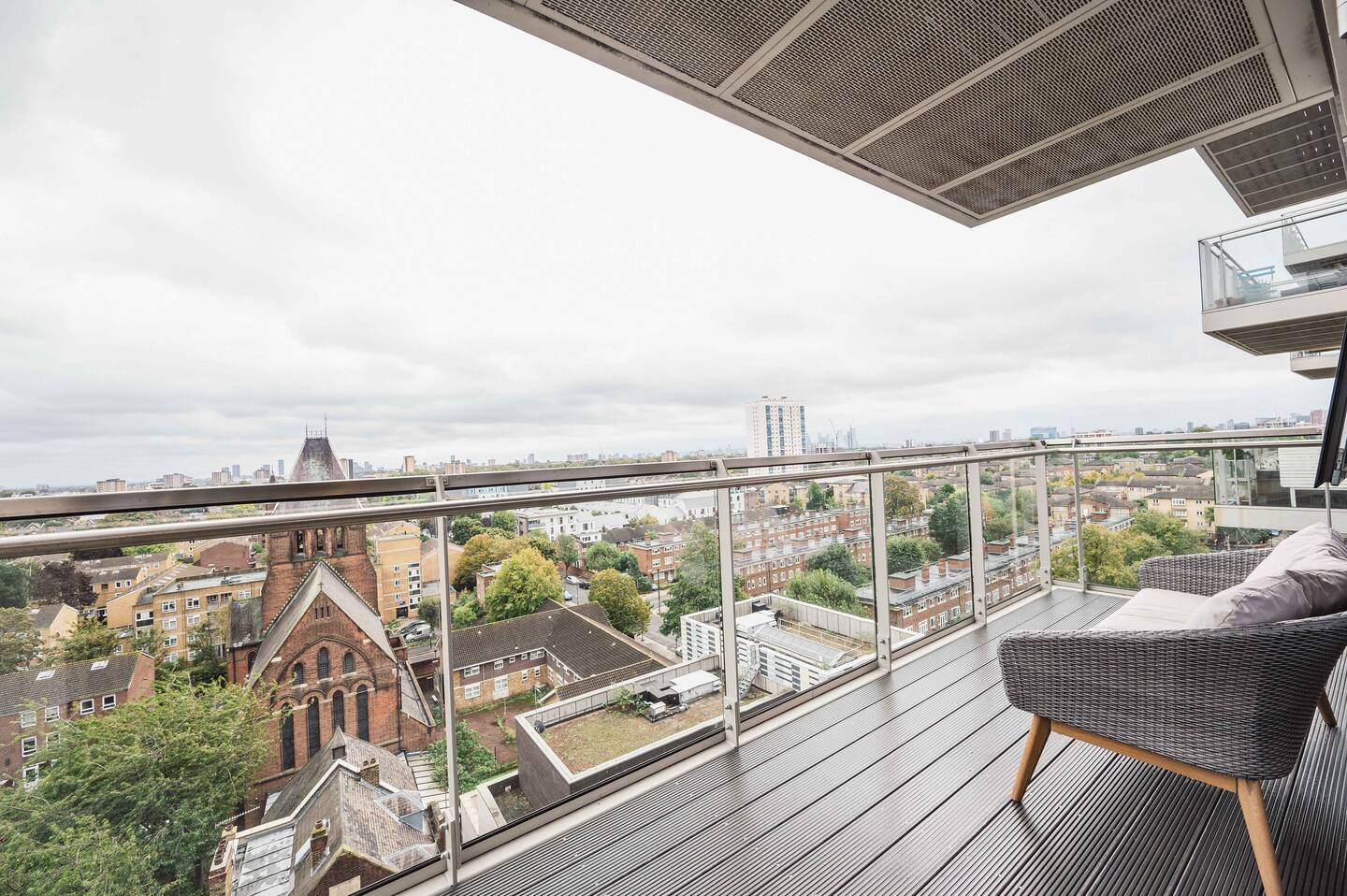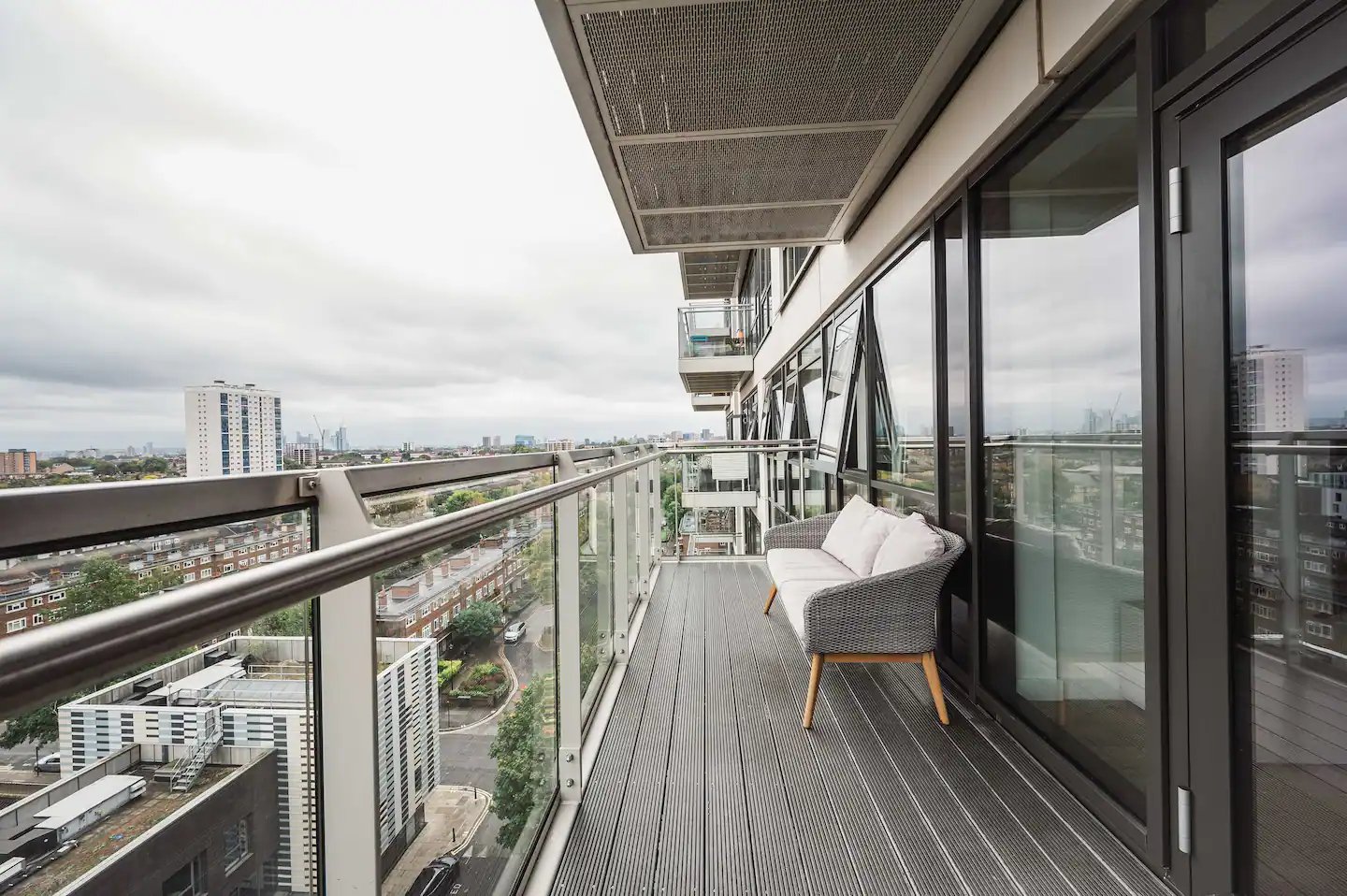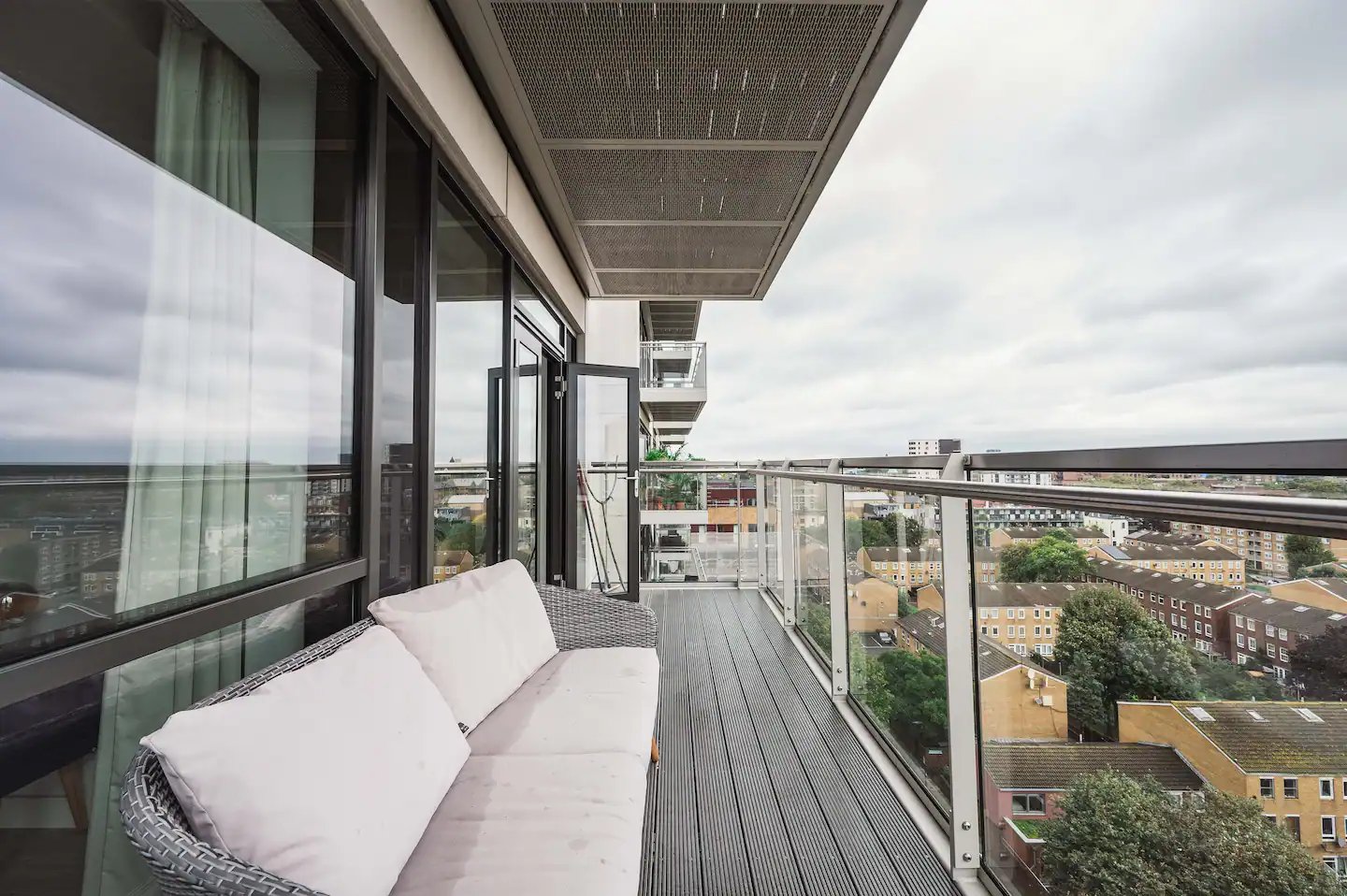 Through double doors in the living area and onto the inviting balcony, you’ll be greeted by a fantastic view over London. Sit on the outdoor sofa and take in the stunning surroundings. Perched on the 8th floor, this vantage point offers magnificent panoramic views of the surrounding area. Whether you’re enjoying your morning coffee, soaking in the afternoon sun, or stargazing in the evening, this space is an oasis of tranquility and beauty that enhances your overall experience in our flat.