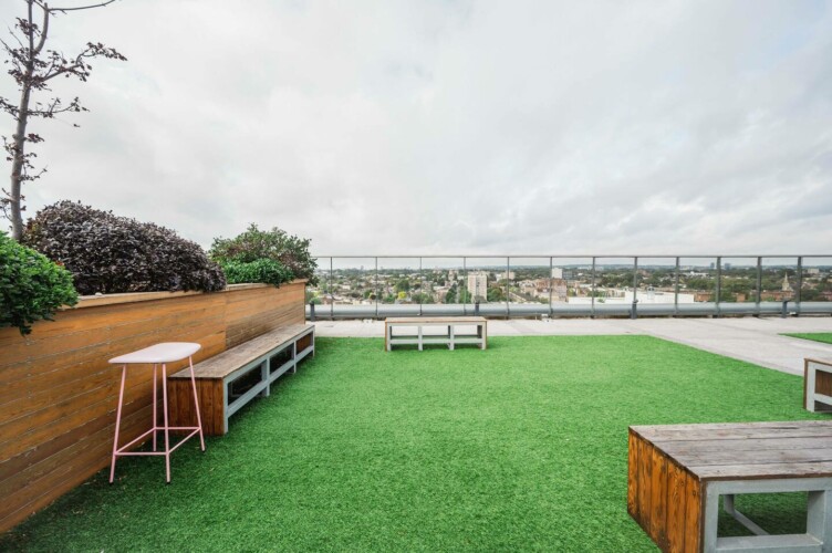 Here, there are benches to relax, chat, or simply enjoy a good book on. You’ll find planters and astroturf that introduce a touch of greenery to the urban landscape.
