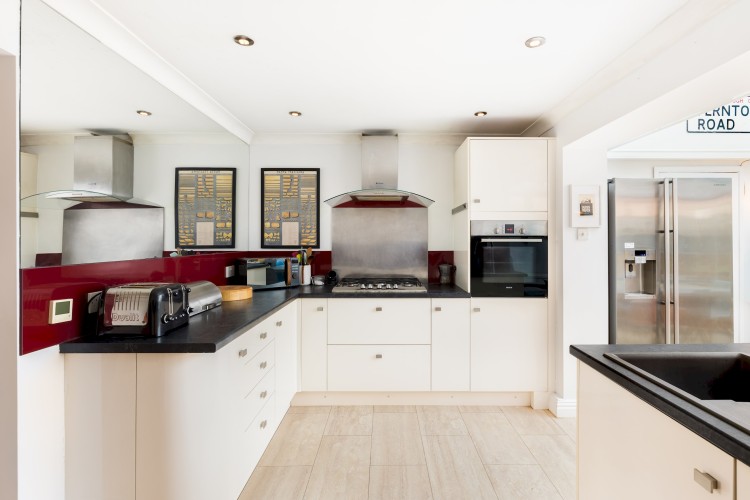 Fully equipped kitchen with oven, hob, fridge/freezer, microwave, kettle, toaster, and cookware