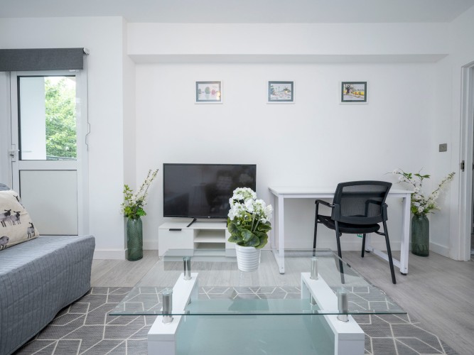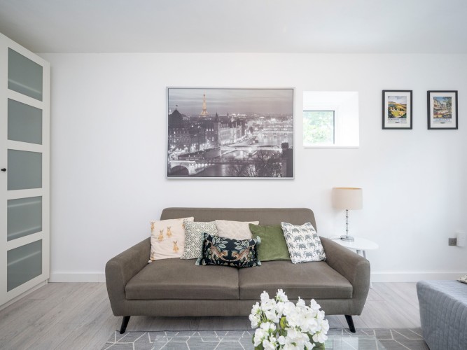 The spacious living room has a warm, family-friendly feel with two comfortable sofas and a flat-screen Smart TV complete with Amazon Fire Stick. Guests can log into Netflix, BBC iPlayer, and other streaming services for a cosy night in after a busy day out.
