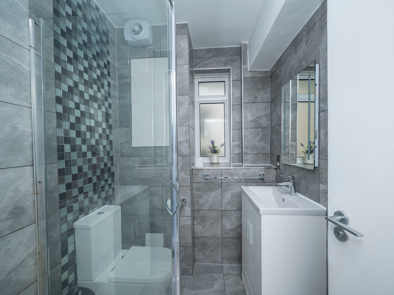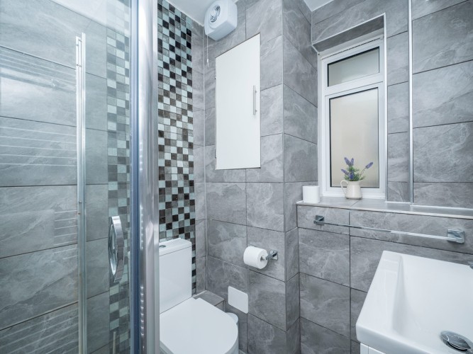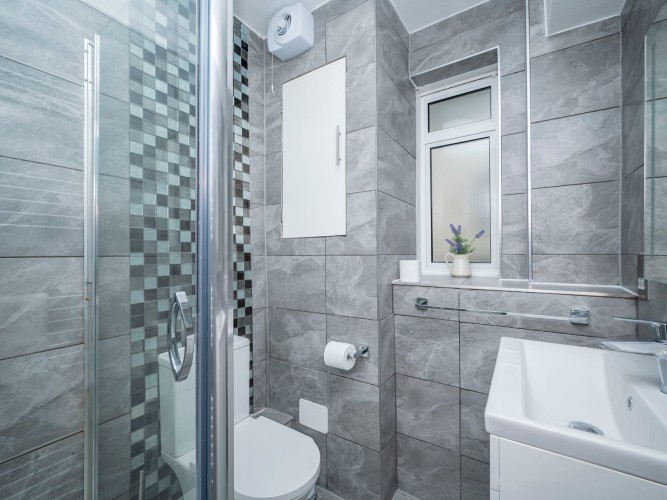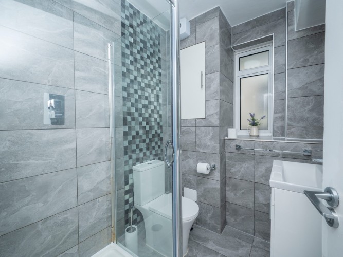 Each of the three double bedrooms is thoughtfully designed with contemporary interiors, soft lighting, and quality bedding. Ample storage is available in all rooms, and fans are provided for the warmer months. A sleek bathroom with a calm grey palette and a separate WC provide added comfort and privacy for groups or families.