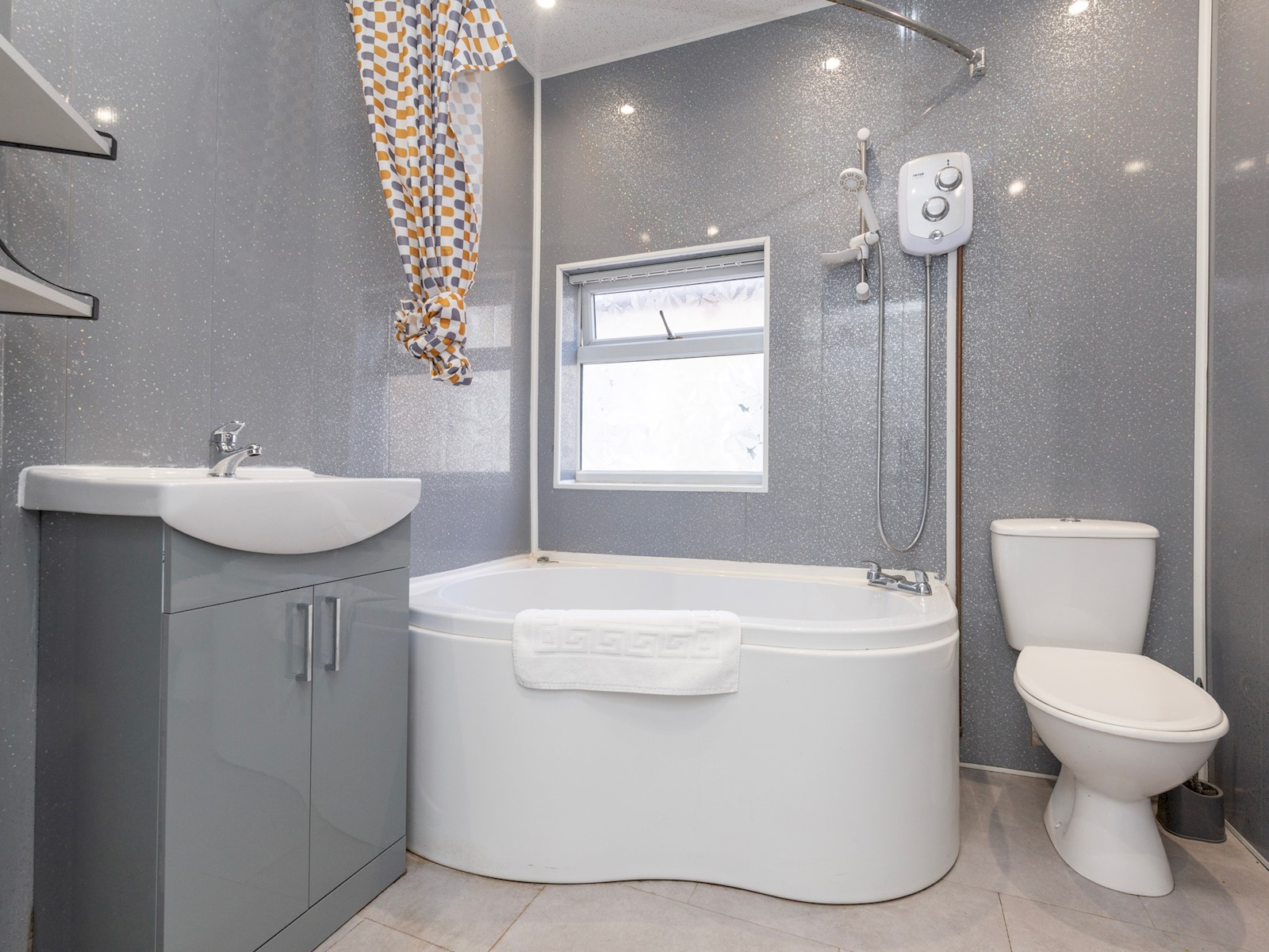 Main Bathroom: A modern space with a bath, overhead shower, sink, and WC. Fresh towels are provided.