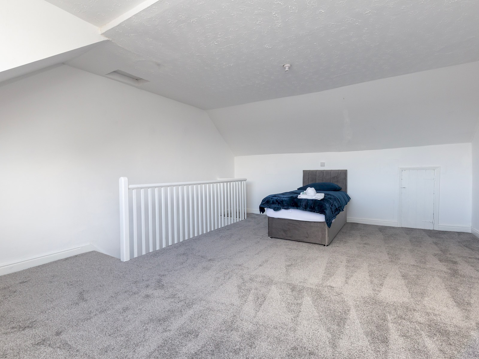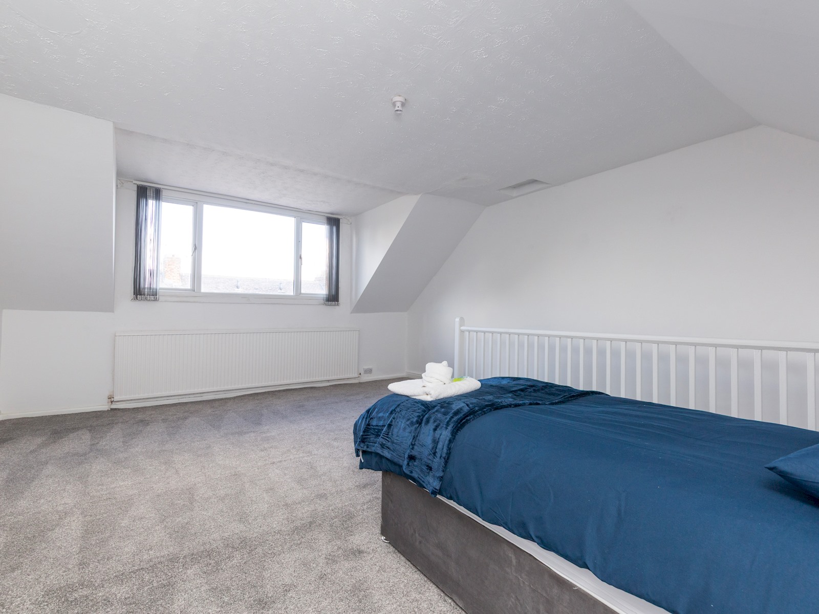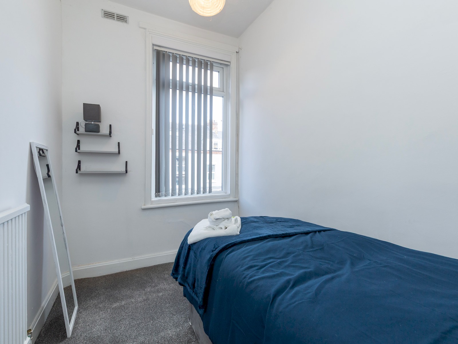 Bedroom 4 (Single): A compact but cheerful room with a single bed, mirror, and shelving — ideal for solo use.