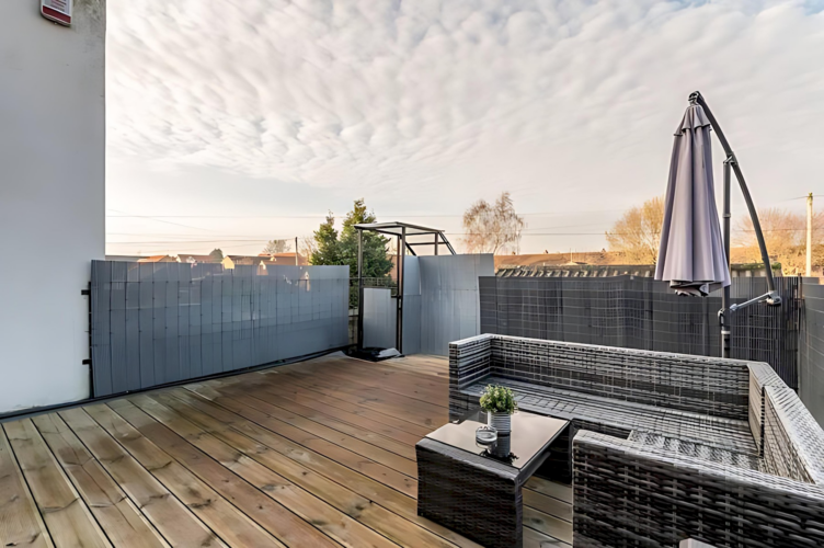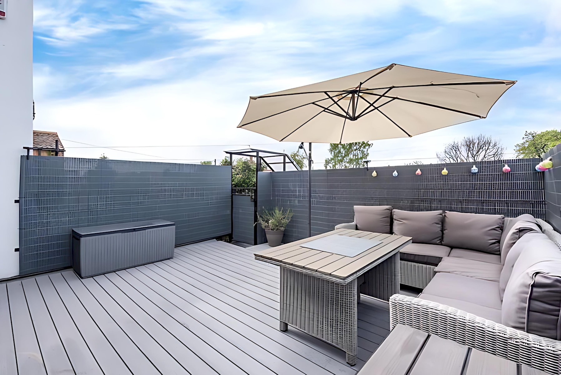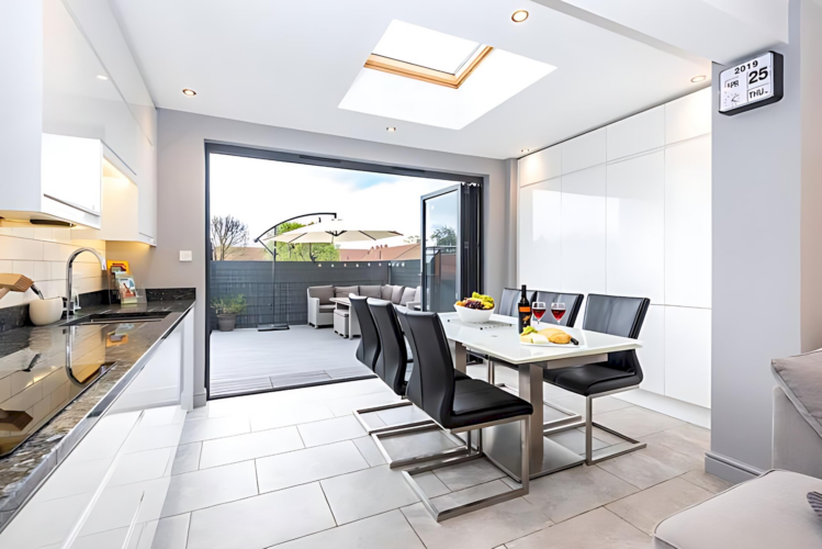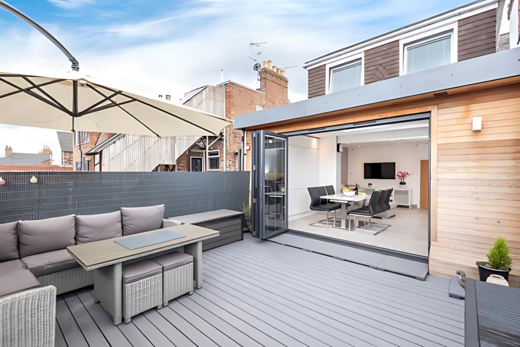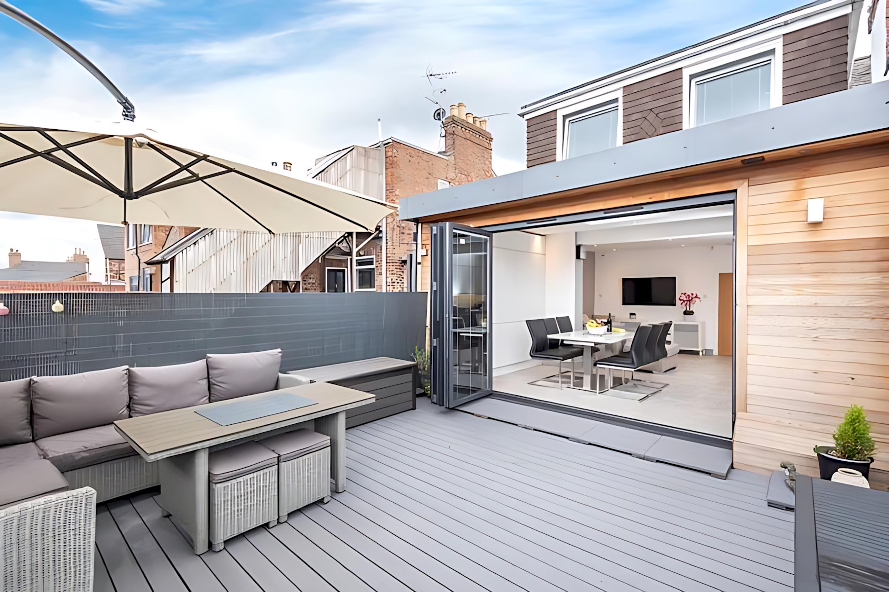 – Bi-fold doors open onto the private rooftop decked area. Here you can enjoy use of luxurious garden furniture on a sunny day.
