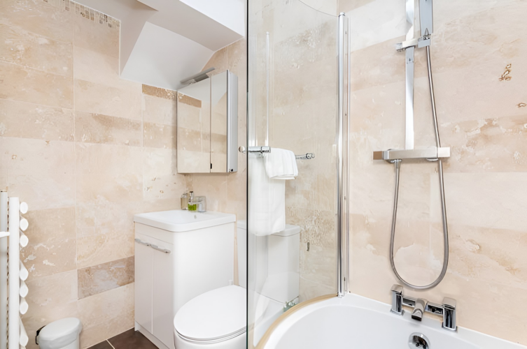 – Bathroom includes a keyhole shape bath, with shower over, a hand basin and toilet.