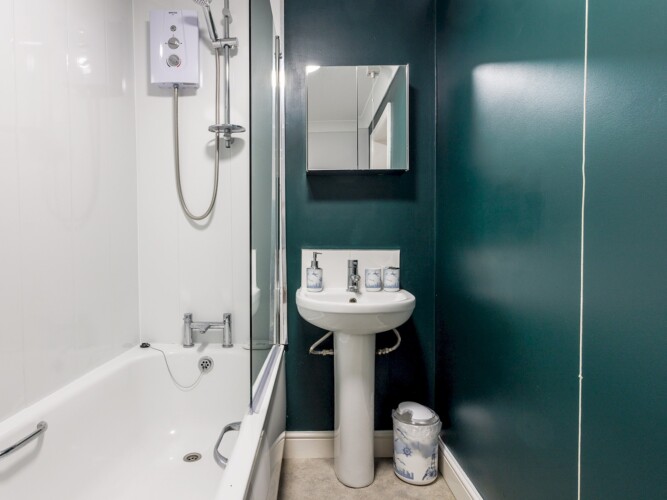 The family bathroom is well-appointed with a full bathtub, offering a perfect way to unwind after a busy day. It also includes a basin, WC, and a shower over the bath.