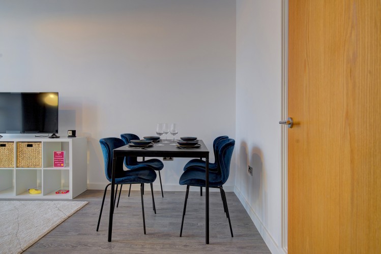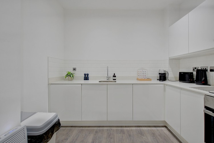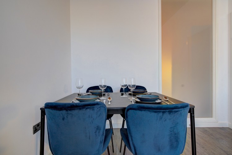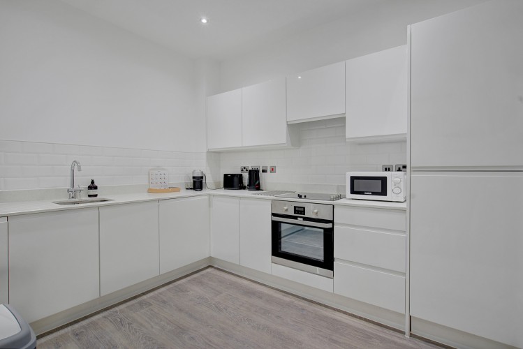 The living area is light-filled and inviting, featuring comfortable seating, making it a great place to unwind after a day in the city. The fully equipped kitchen includes everything needed to prepare meals at home, whether you’re staying for a few nights or a few weeks.