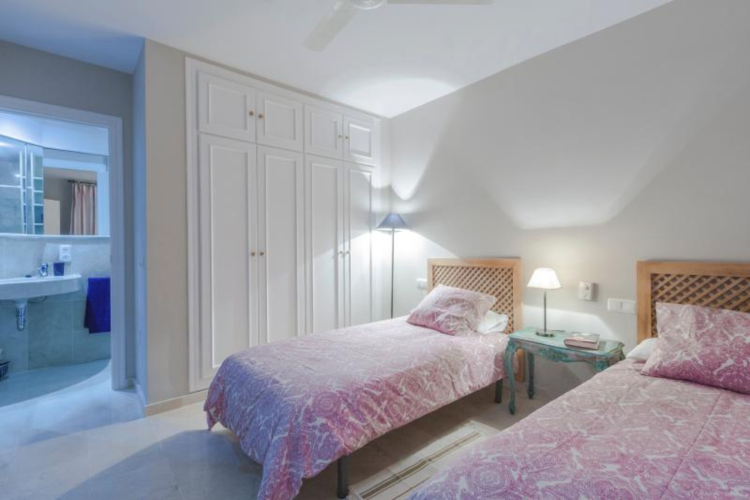 A second bedroom with twin beds and fitted wardrobes, featuring an en-suite bathroom.