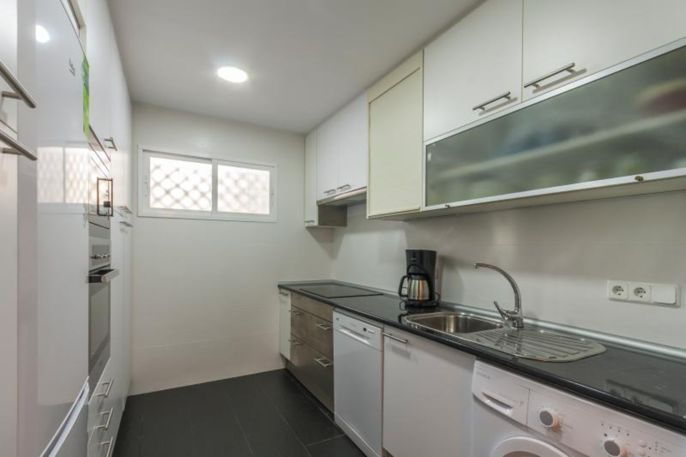 The fully equipped kitchen includes an oven, hob, microwave, fridge-freezer, dishwasher, washing machine and coffee maker, making it suitable for both short and longer stays.
