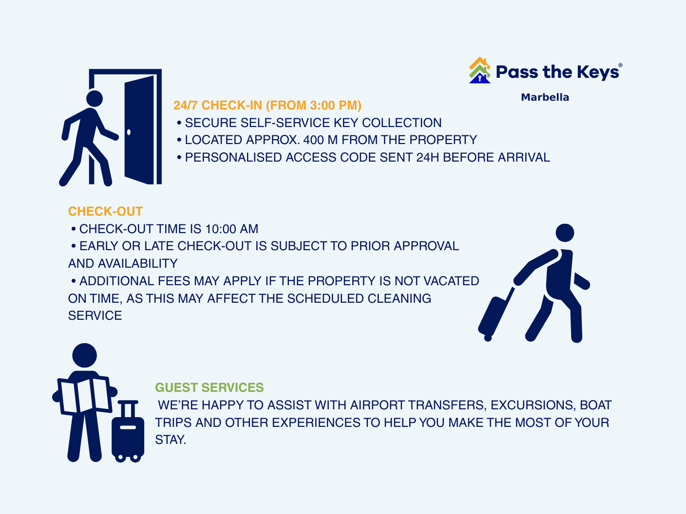 An unauthorised early check-in or late check-out may incur a €50 fee, as it disrupts the scheduled cleaning service.