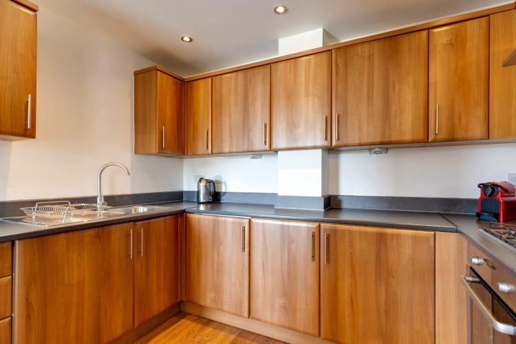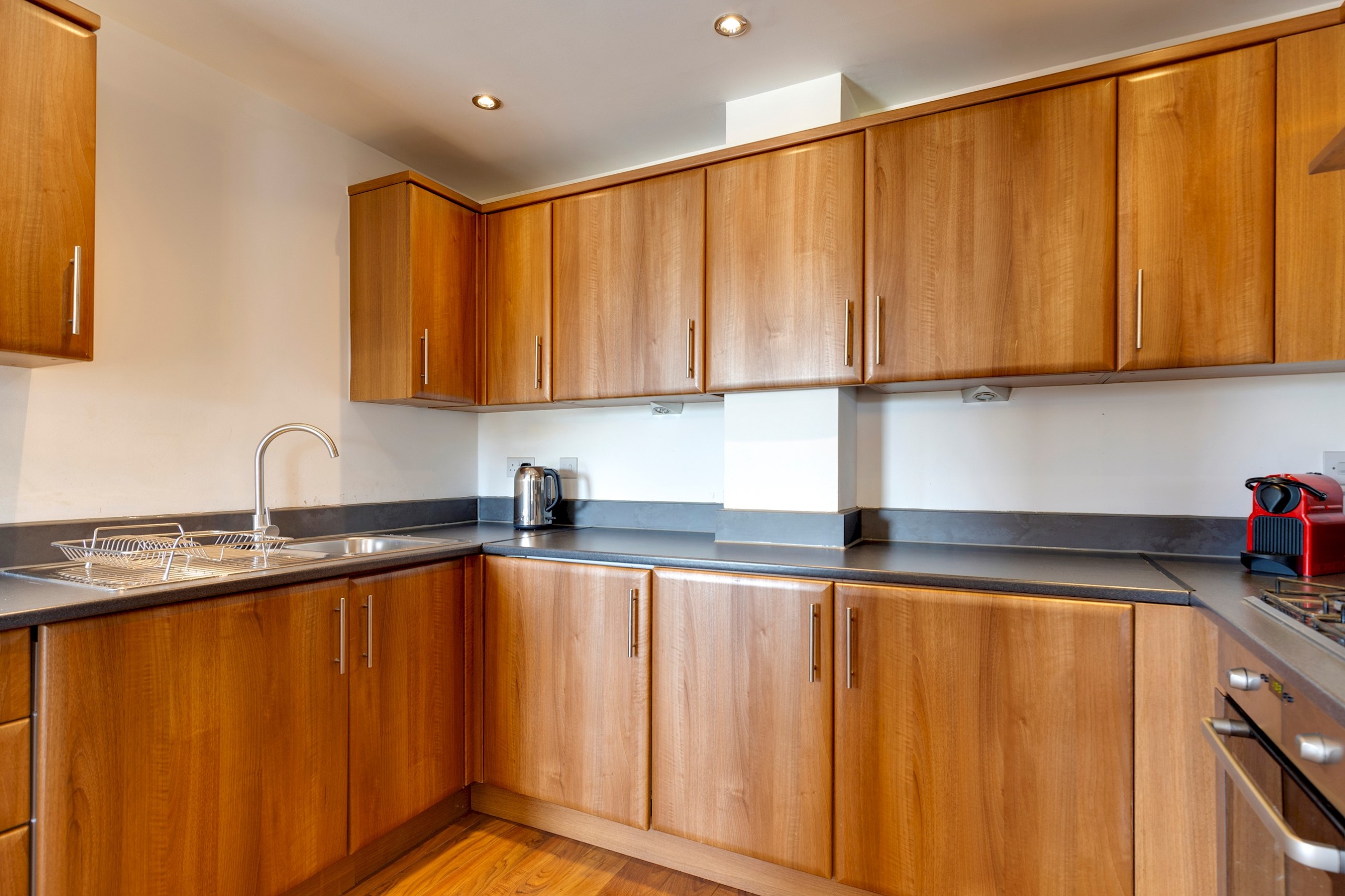 The modern kitchen is kitted out for home dining with basic amenities provided. Use of appliances include an oven, gas hob, fridge and freezer. Smaller appliances include a microwave, coffee machine, toaster, and kettle. There is also a washer/dryer available for personal use.