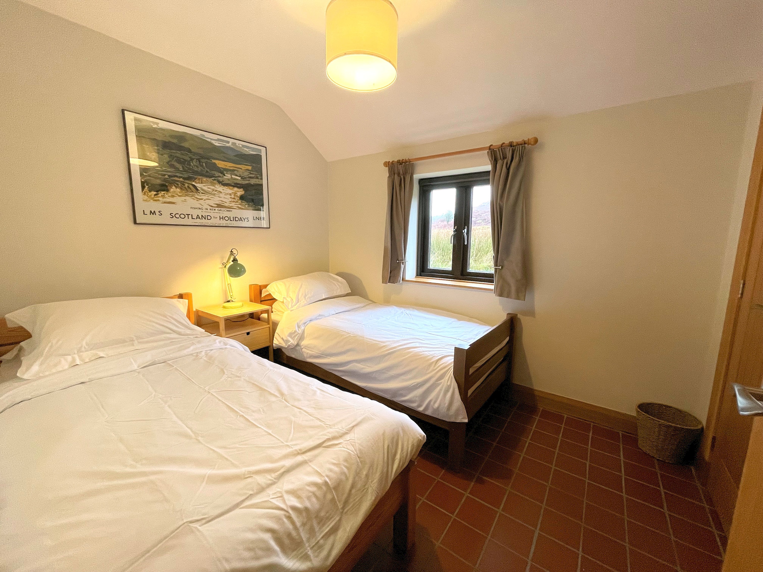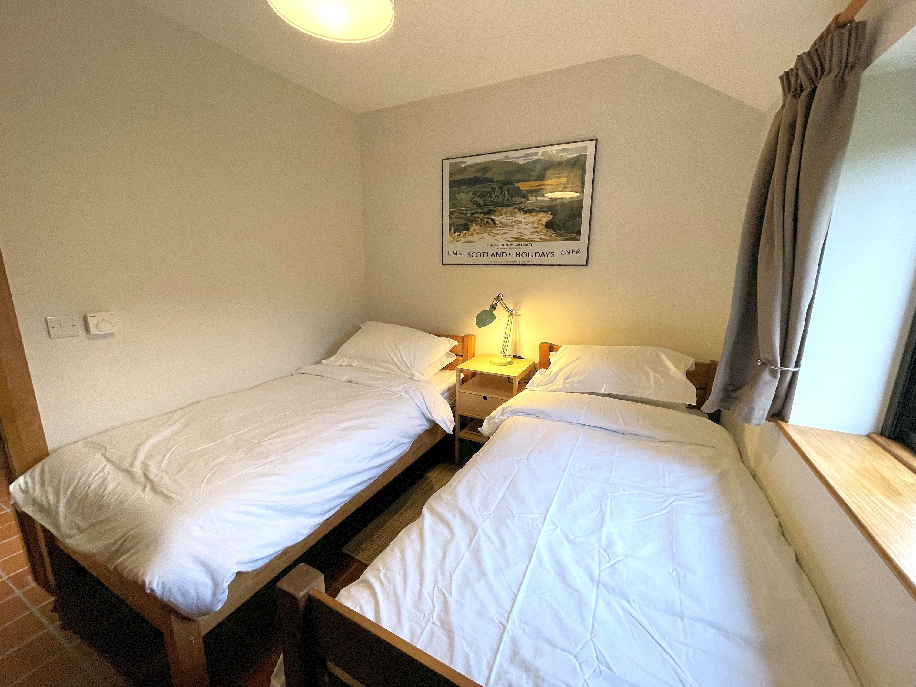 Bedroom 3:- Twin beds with bedside table and wardrobe.