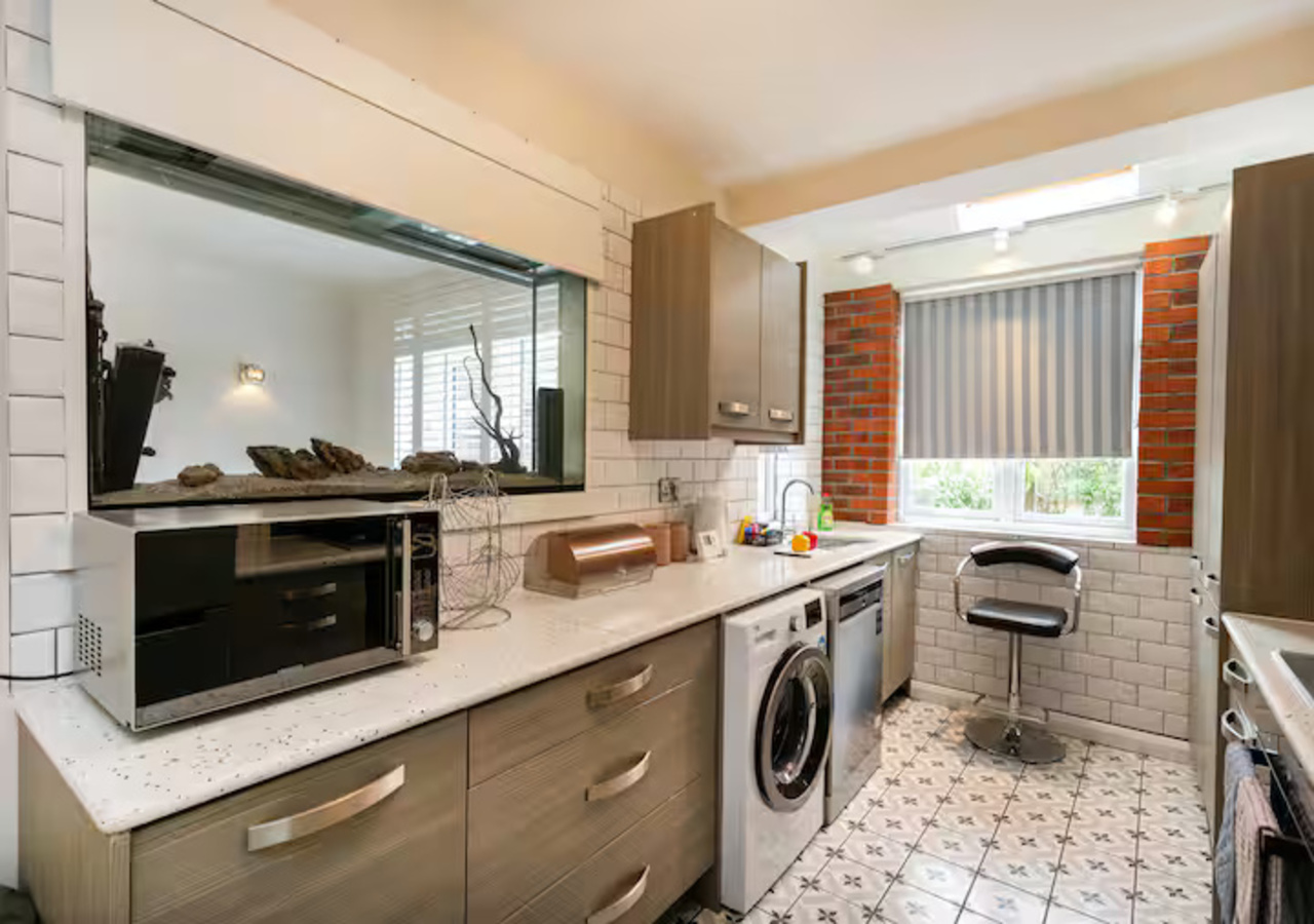 The fully equipped kitchen includes modern appliances such as an oven, hob, microwave, dishwasher and washing machine, making both short and extended stays seamless.