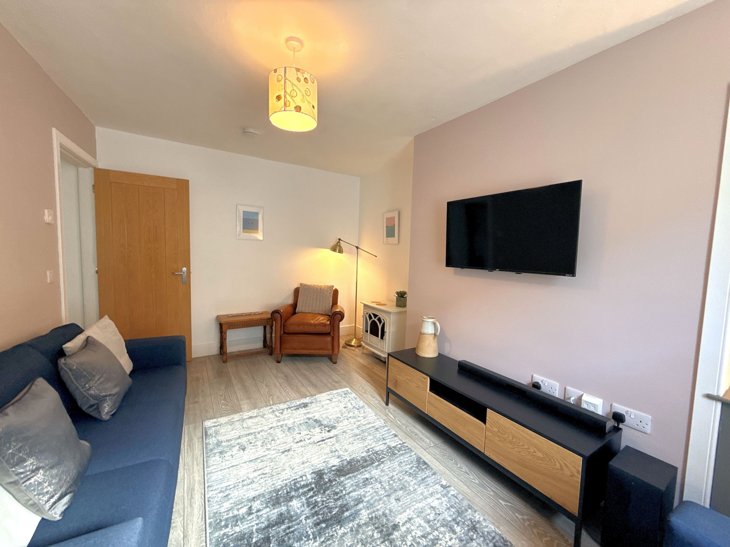 Sitting Room – A charming and cosy space featuring a wall-mounted Smart TV with soundbar, comfy sofas for relaxing, and a reading chair beside the feature fireplace. There’s plenty of room for family games or simply unwinding after a day of exploring.