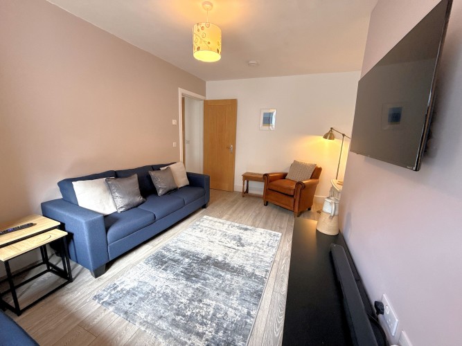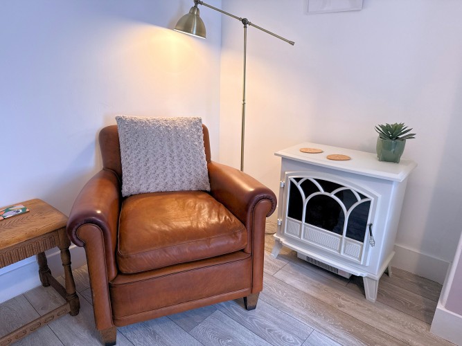 Sitting Room – A charming and cosy space featuring a wall-mounted Smart TV with soundbar, comfy sofas for relaxing, and a reading chair beside the feature fireplace. There’s plenty of room for family games or simply unwinding after a day of exploring.