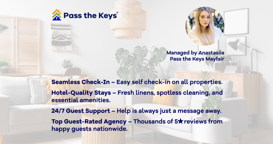 Hello, I am Anastasiia, the Managing Director of Pass The Keys - Mayfair, and it is a delight to be a part of the Pass The Keys family. With over fifteen years of collective hospitality expertise, we take pride in delivering exceptional services daily. Our diverse property portfolio spans across London, including the prestigious Mayfair district. From seamless back-to-back cleaning sessions to coordinating maintenance services, we ensure a hassle-free hosting experience for all our hosts. With our seven-day operational coverage, guests can rest assured that their stay will surpass expectations, backed by unlimited 24/7 guest support.