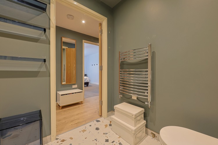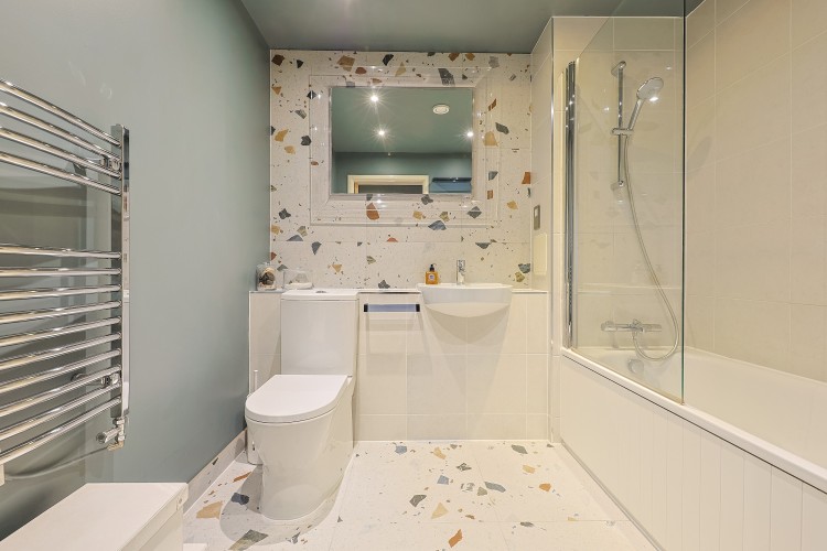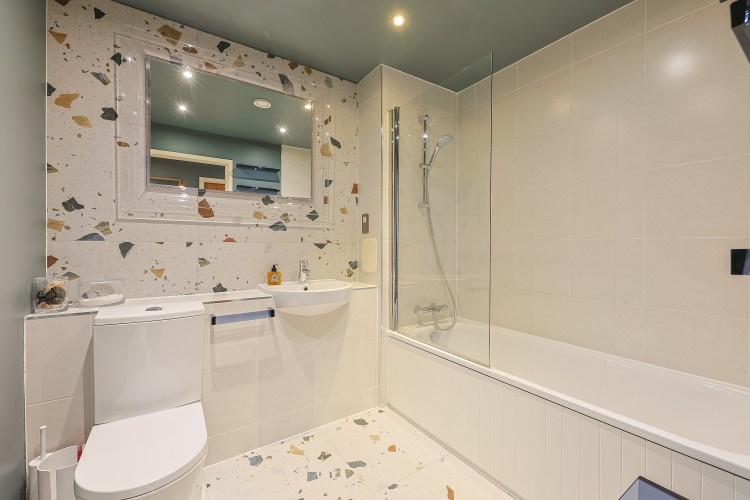 The separate bedroom is a cozy retreat with a feature headboard and contemporary lighting, promising restful sleep. The bathroom showcases modern tiling and fixtures—with terrazzo‑style accents—for a refined touch.
