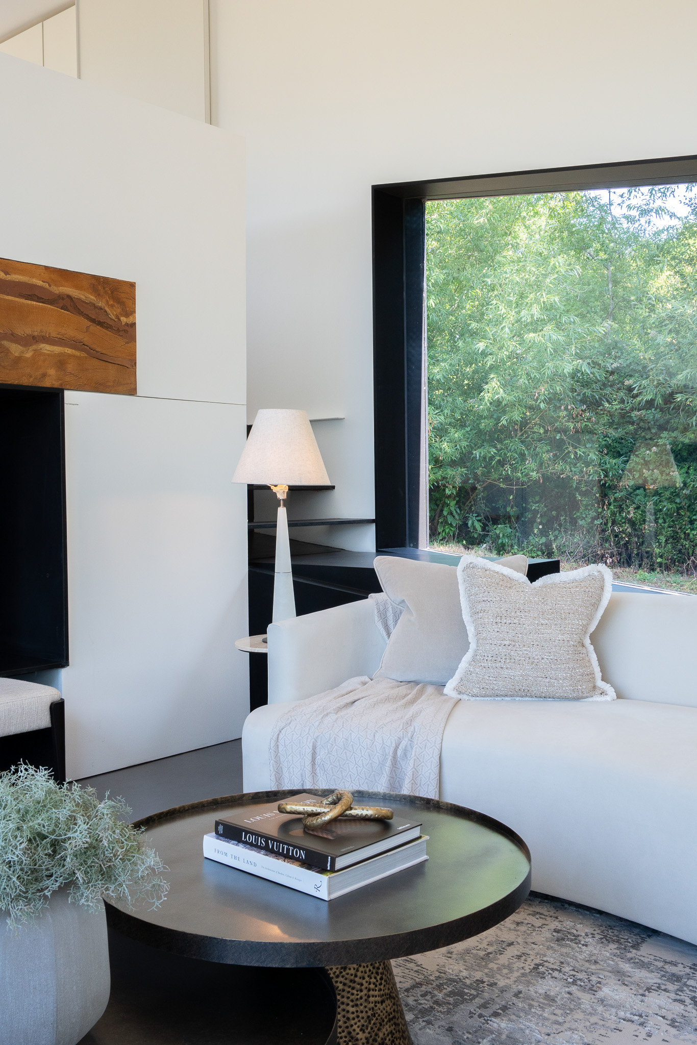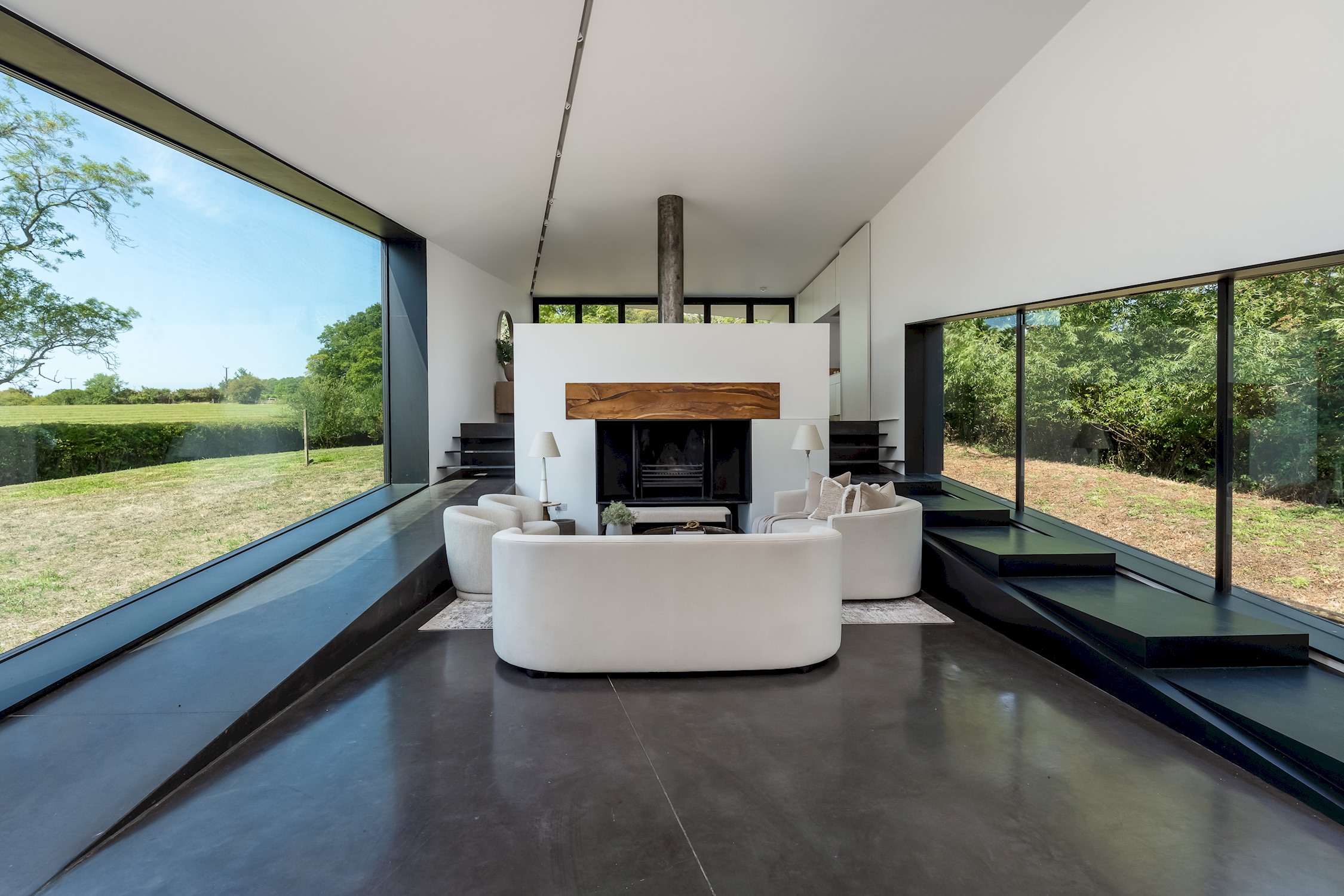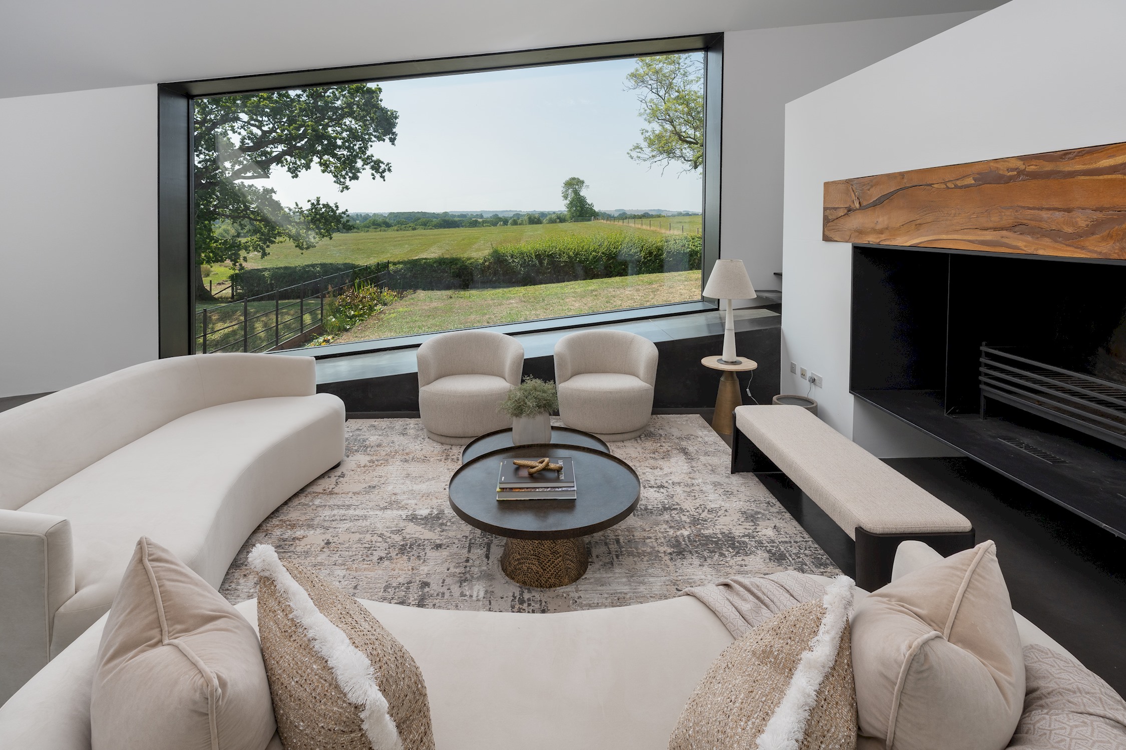 Architectural Elegance Meets Comfort – Striking modern design with curved sofas, floor-to-ceiling windows, and serene countryside views