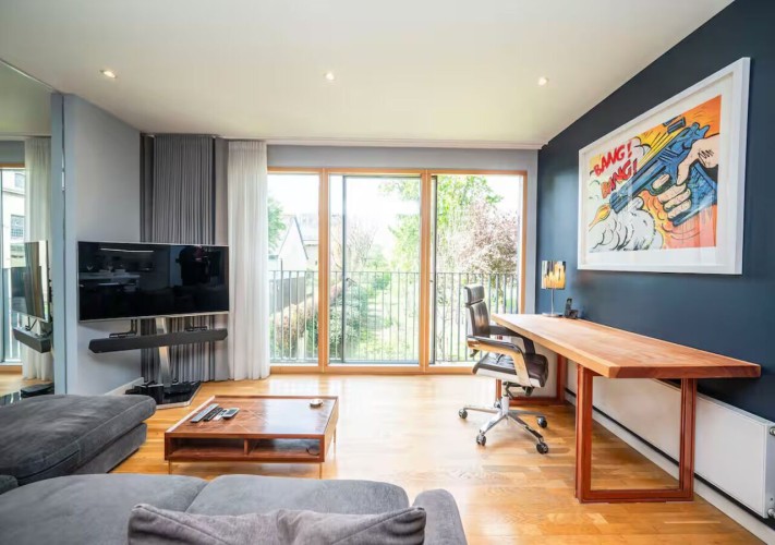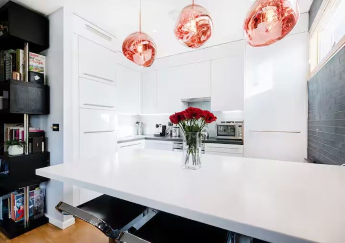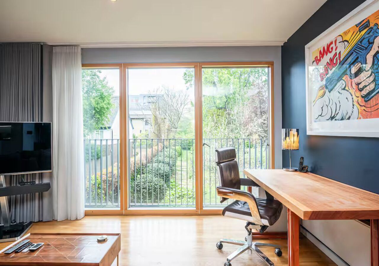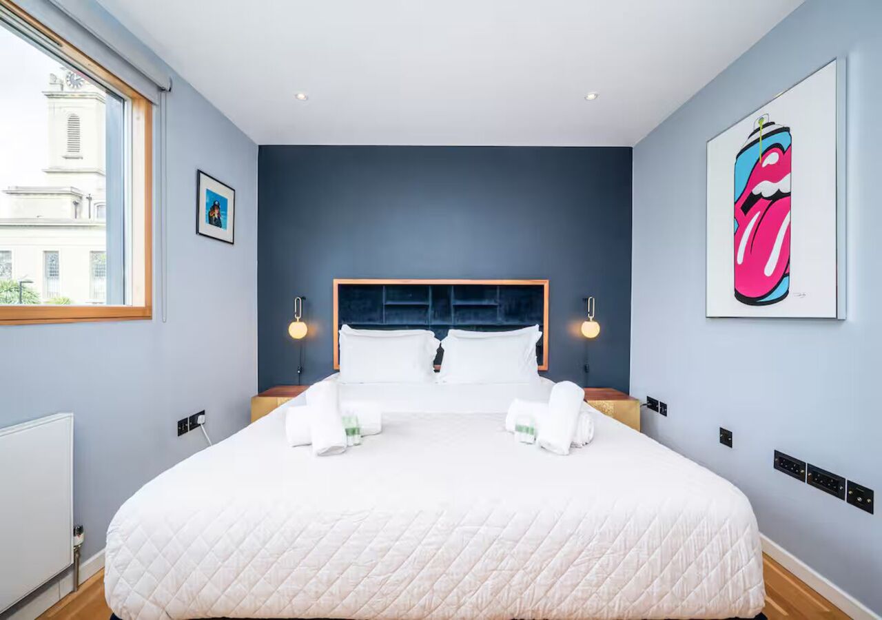 Further along the hallway is the open-plan kitchen/living area. There is a fully integrated kitchen with all appliances/conveniences and plentiful cupboard and workspace. There is a Nespresso coffee machine to enjoy, with some pods available. The kitchen leads on to a stylish island table with stool seating where guests can enjoy meals together. The bright living room area, has modern artwork and a supersized, comfortable sofa with cushions where the stunning Church and garden views can be enjoyed or where guests can relax reading or watching TV. This room benefits from floor-to-ceiling windows with natural light pouring in. One of these windows opens out and slides along for a Juliette balcony on warmer days. Alongside the sofa and TV there is a coffee table and the added convenience of a large desk and comfortable chair for guests wishing to work or study.