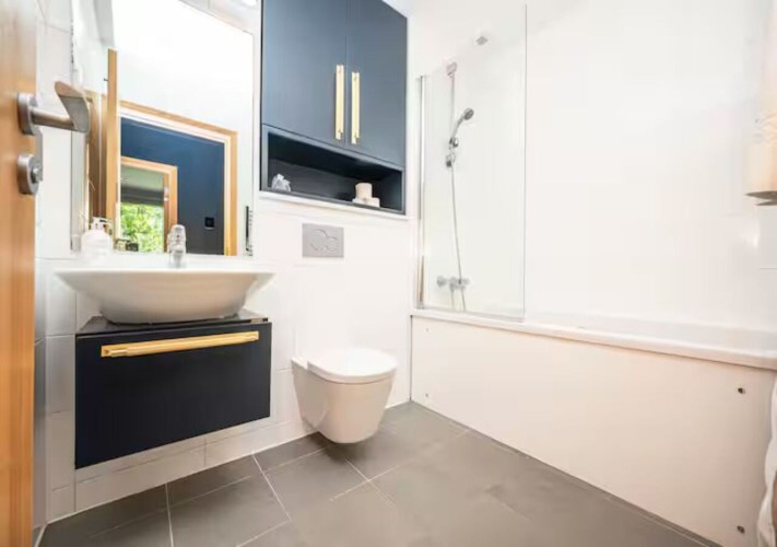 On entering the living space, along the hallway is the modern, light-filled bedroom on the right. The bedroom is perfectly located at the back of the property, overlooking the Church gardens. There is a comfortable (real) King sized bed, bedside tables and wall lamps and a wonderfully sized fitted wardrobe with sliding mirrored doors, for guest belongings.