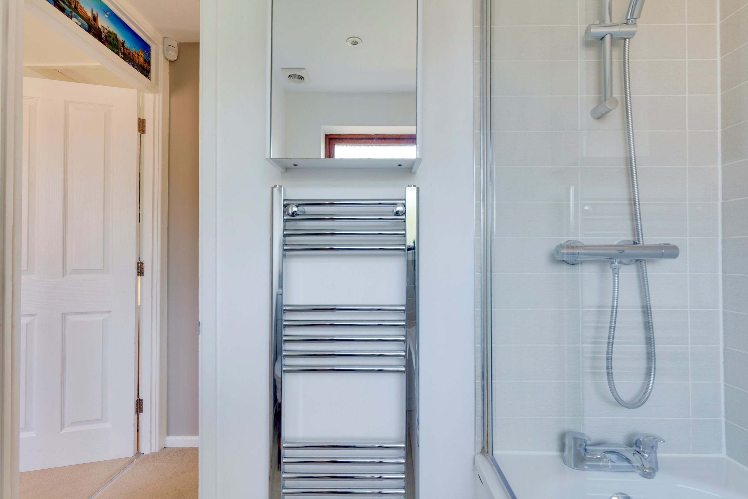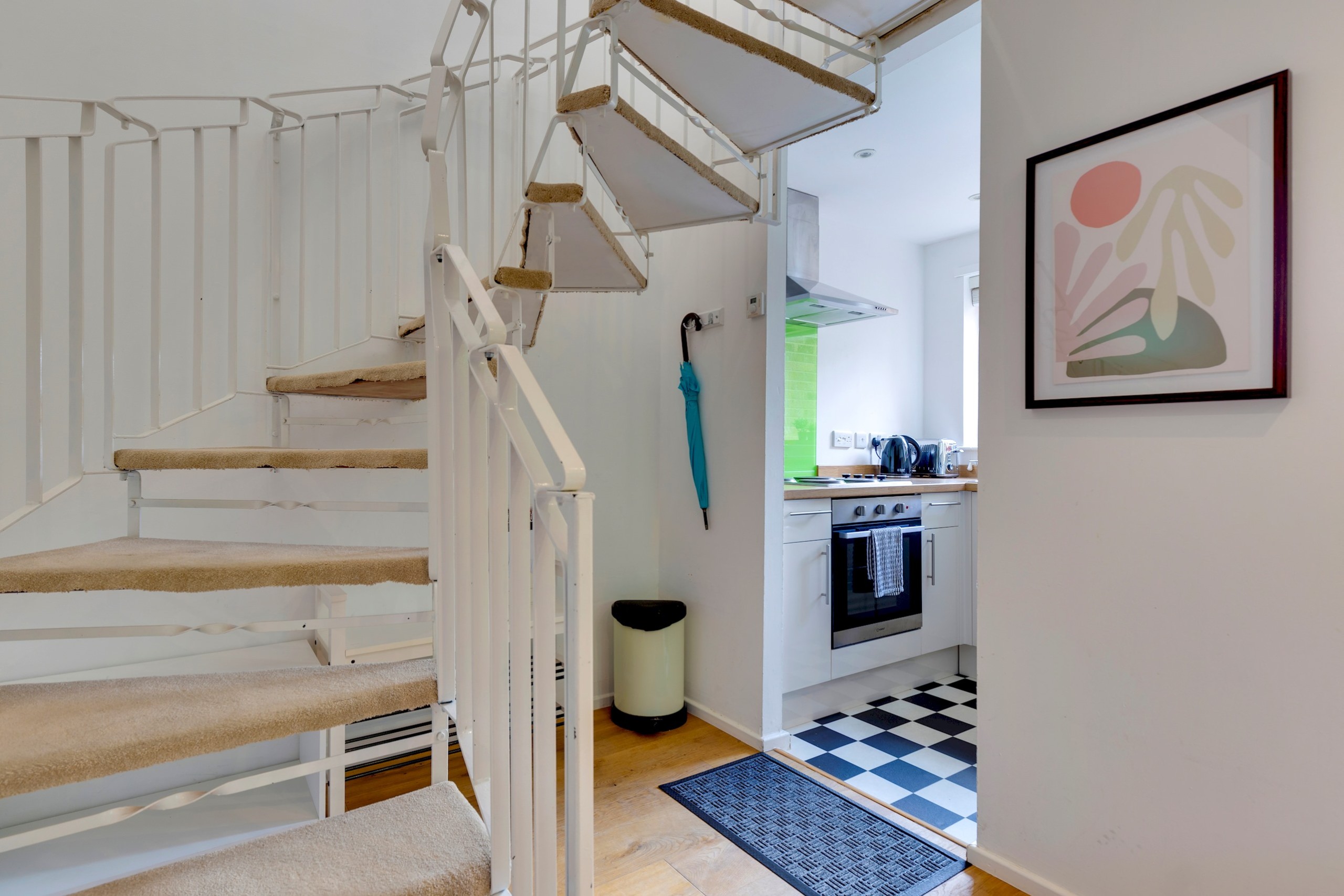 The ground floor is comprised of a bright and modern minimalist living room, the perfect place to enjoy a good book, drink a coffee or catch up on TV. The brand new kitchen is fully equipped with a microwave, electrical hob, oven, washer, fridge/ freezer, kettle and cooking equipment.
