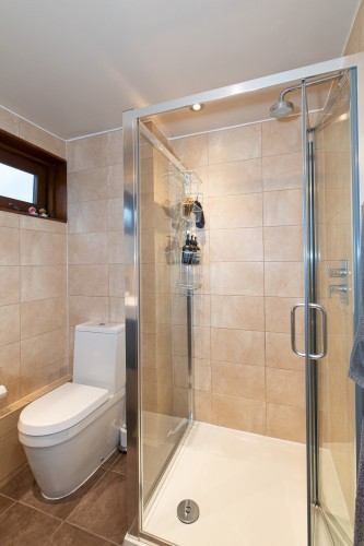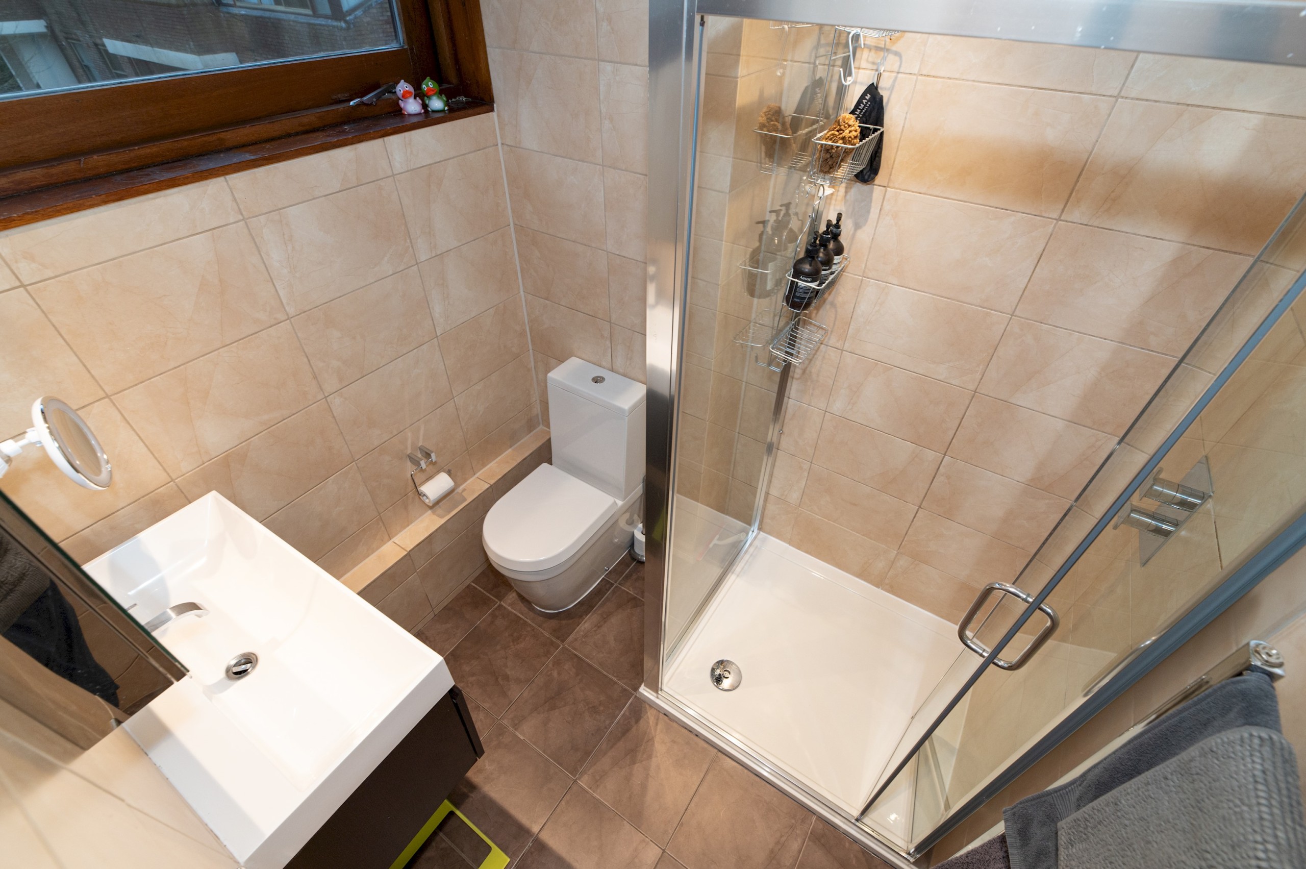 The modern bathroom includes a large walk-in shower, fresh towels, and a hairdryer stored in the bedroom wardrobe.