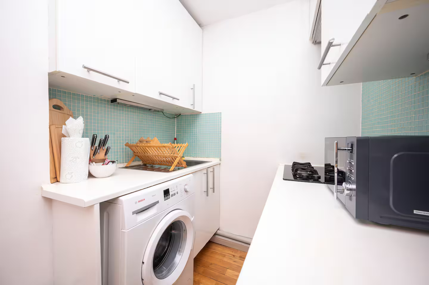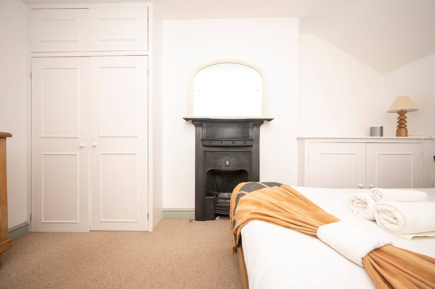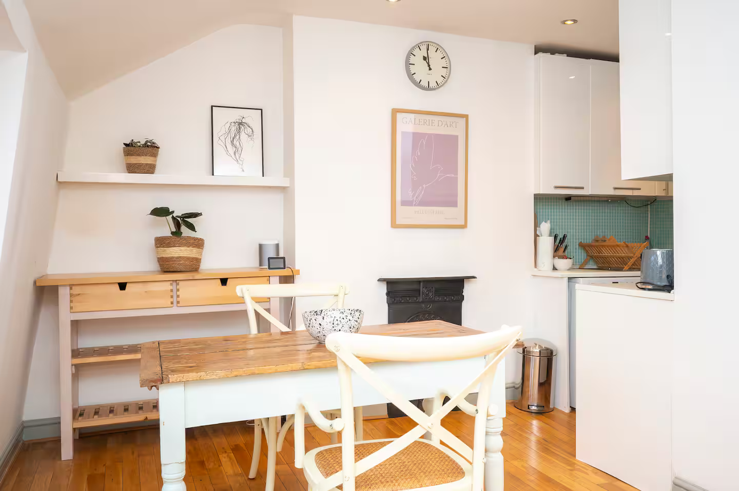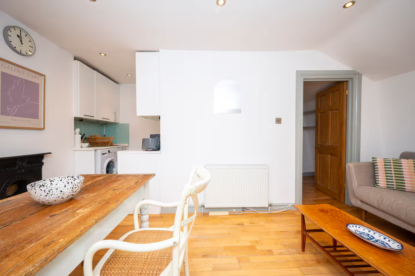 Inside, the layout flows beautifully. The living room is bright and open, with space to unwind, read, or enjoy a slow breakfast at the dining table. The kitchen is compact but fully equipped — whether you’re cooking a proper dinner or just warming up pastries from Church Street’s bakeries.