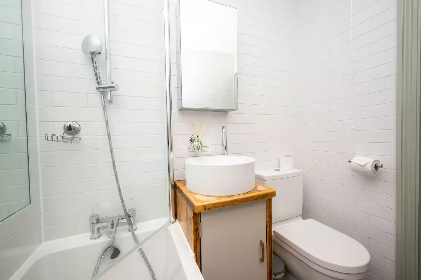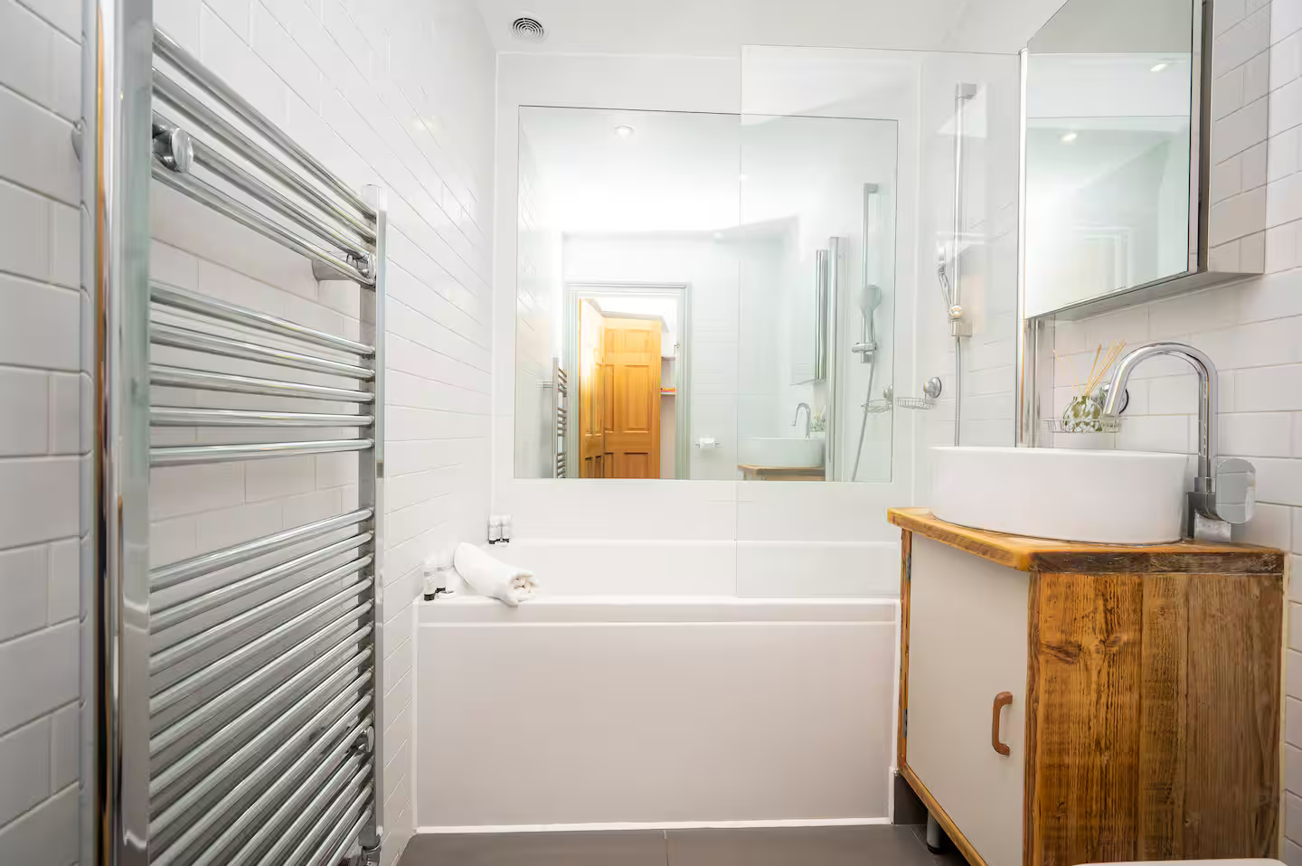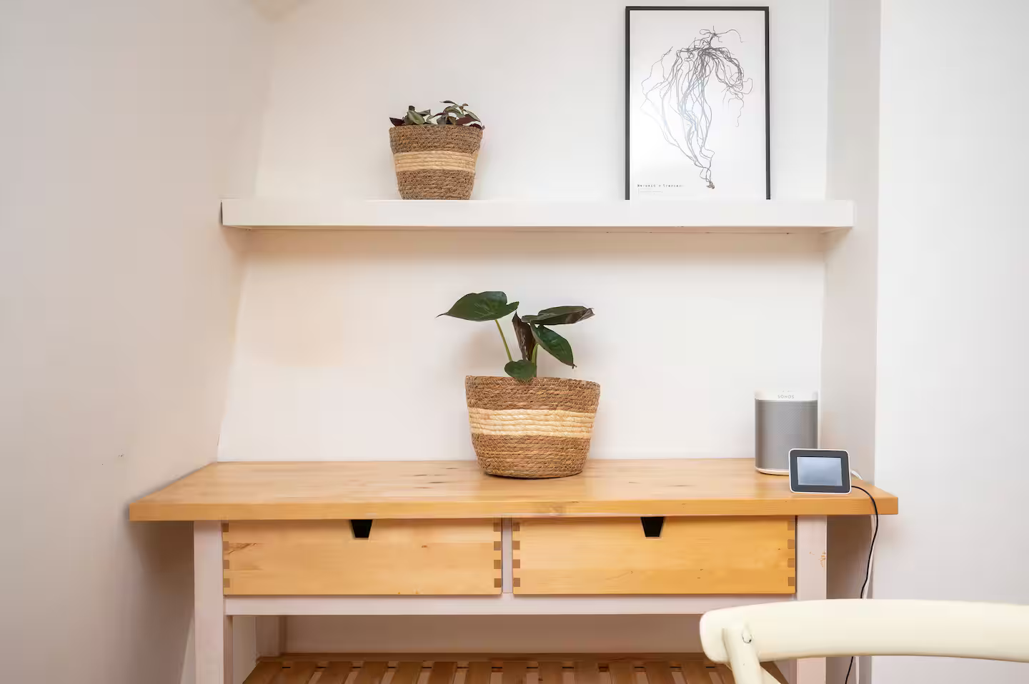 The bedroom feels cosy and grounded, with warm light and soft textures that make it easy to rest. Next door, a dedicated office offers a calm space to work, think, or simply pause with a view of the trees. The bathroom is fresh and modern, with a full tub for long, relaxed soaks after exploring one of the many nearby parks.