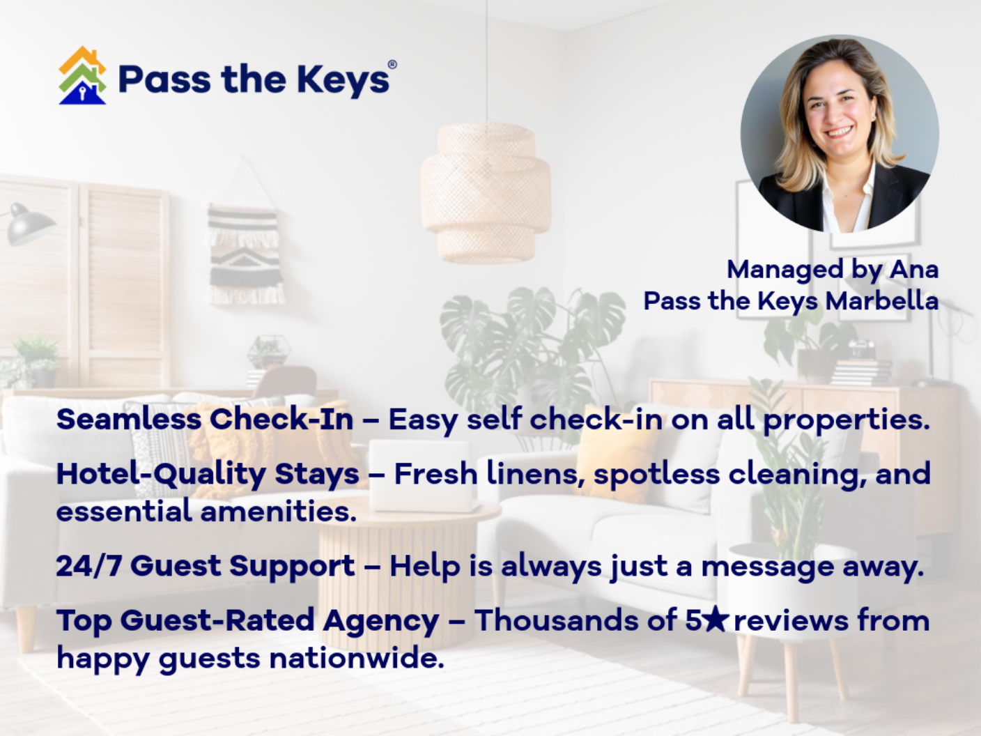 Hi, I'm Ana. As the City Manager of Pass the Keys in Marbella, I’m proud to represent a place that truly feels like home. Marbella offers a unique lifestyle where the sea meets the mountains, and every day feels like a breath of fresh air. One of the most rewarding parts of my role is supporting homeowners throughout the entire process, offering them peace of mind and helping them make the most of their property without the stress.