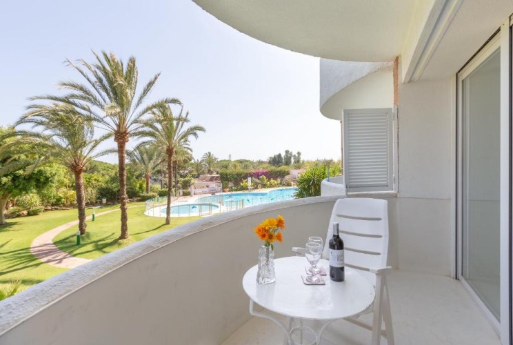 Enjoy a bright and elegant stay in this stylish studio located in Edificio Coronado, in the sought-after Playa Real area of Elviria. The studio features a comfortable sleeping area, a modern open-plan kitchen and a cozy living space with access to a private terrace overlooking the gardens. Set within a well-maintained urbanization with communal swimming pool, and just a short walk to the beach and nearby restaurants, it’s an ideal base to enjoy Marbella’s coast in comfort and style.