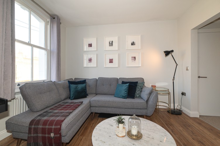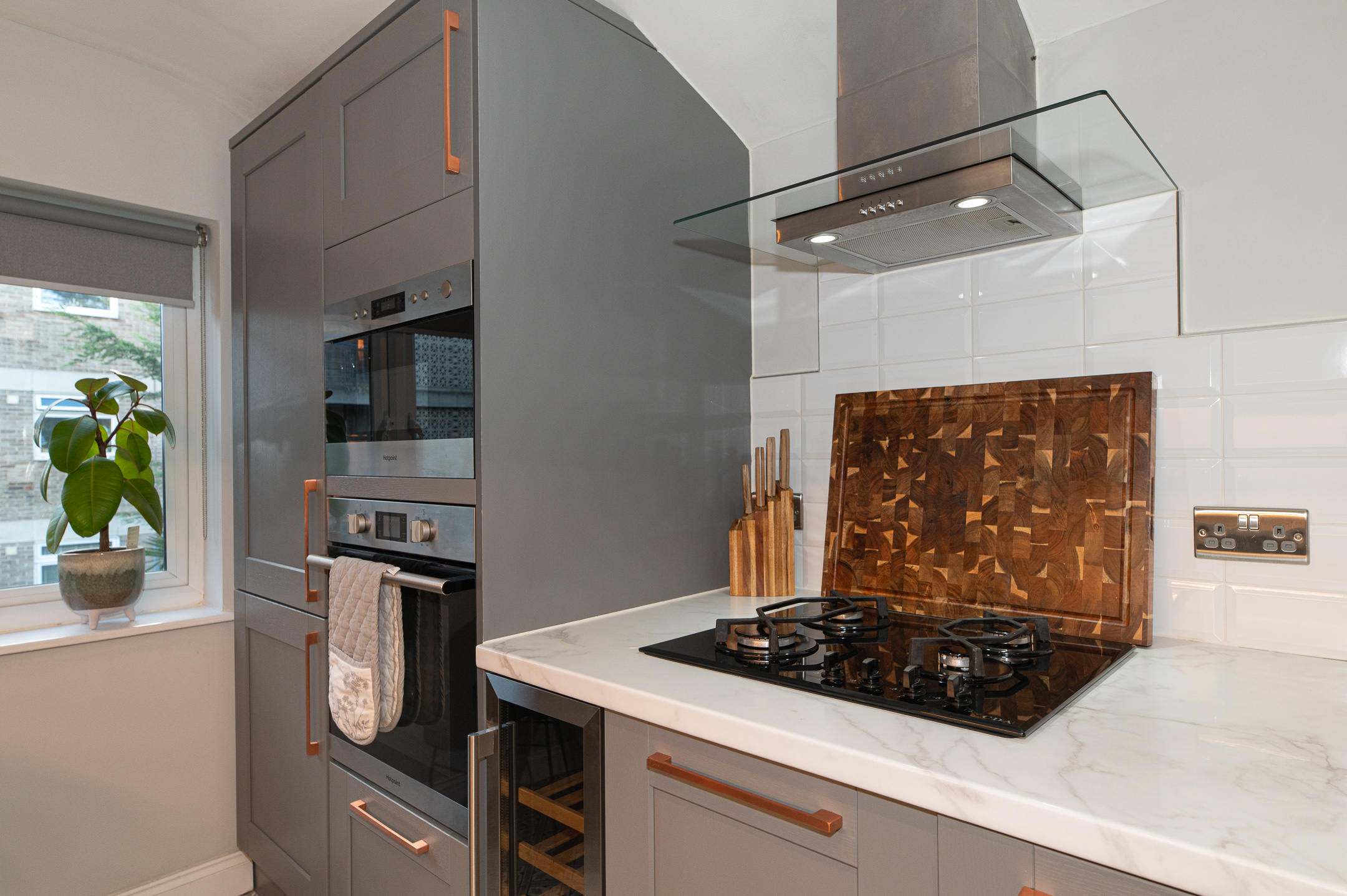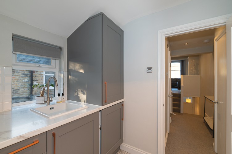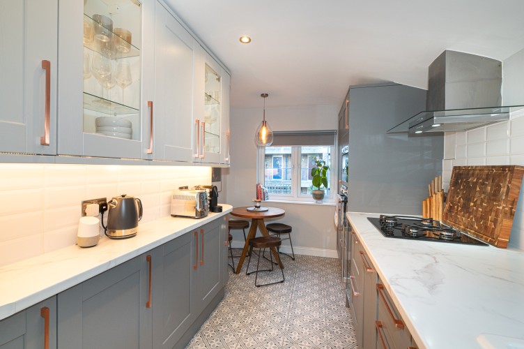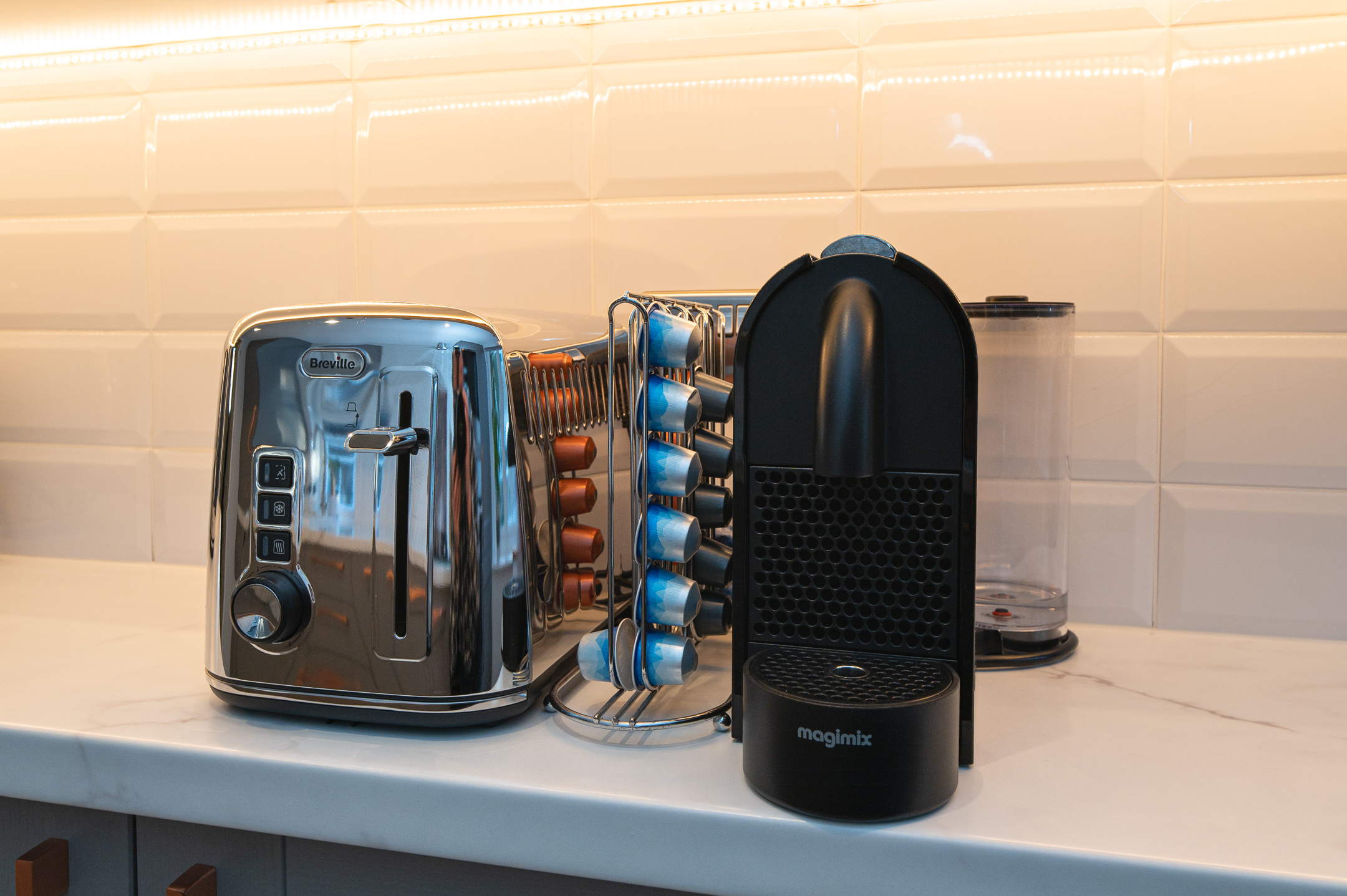 The living room is bright and welcoming with a comfortable sofa. It is a great space to unwind with a Smart TV and fast, reliable WiFi. The kitchen is fully fitted and well equipped, perfect for cooking proper meals or enjoying a relaxed breakfast at home.