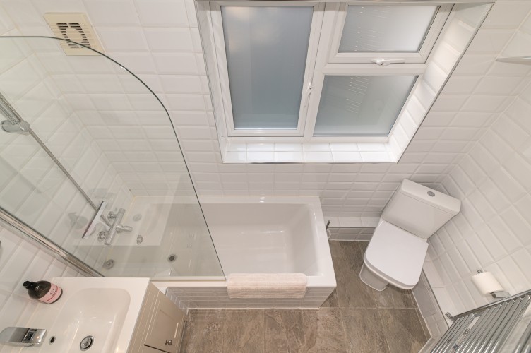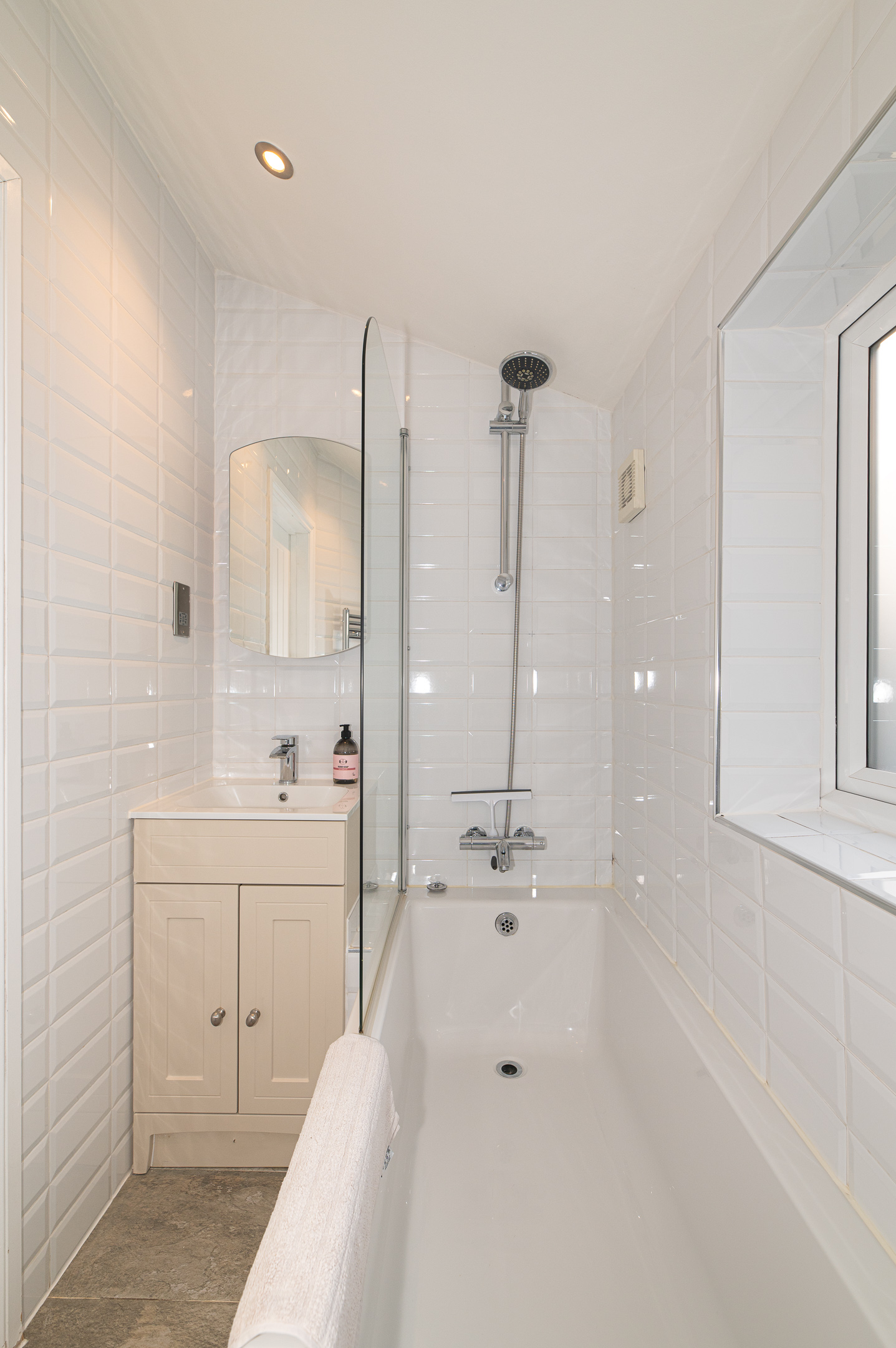 The bedroom features a cosy double bed and a large wardrobe, giving you plenty of space to settle in and feel comfortable. The bathroom is clean and modern with a shower over the bath, ideal for both quick mornings and slow evenings.
