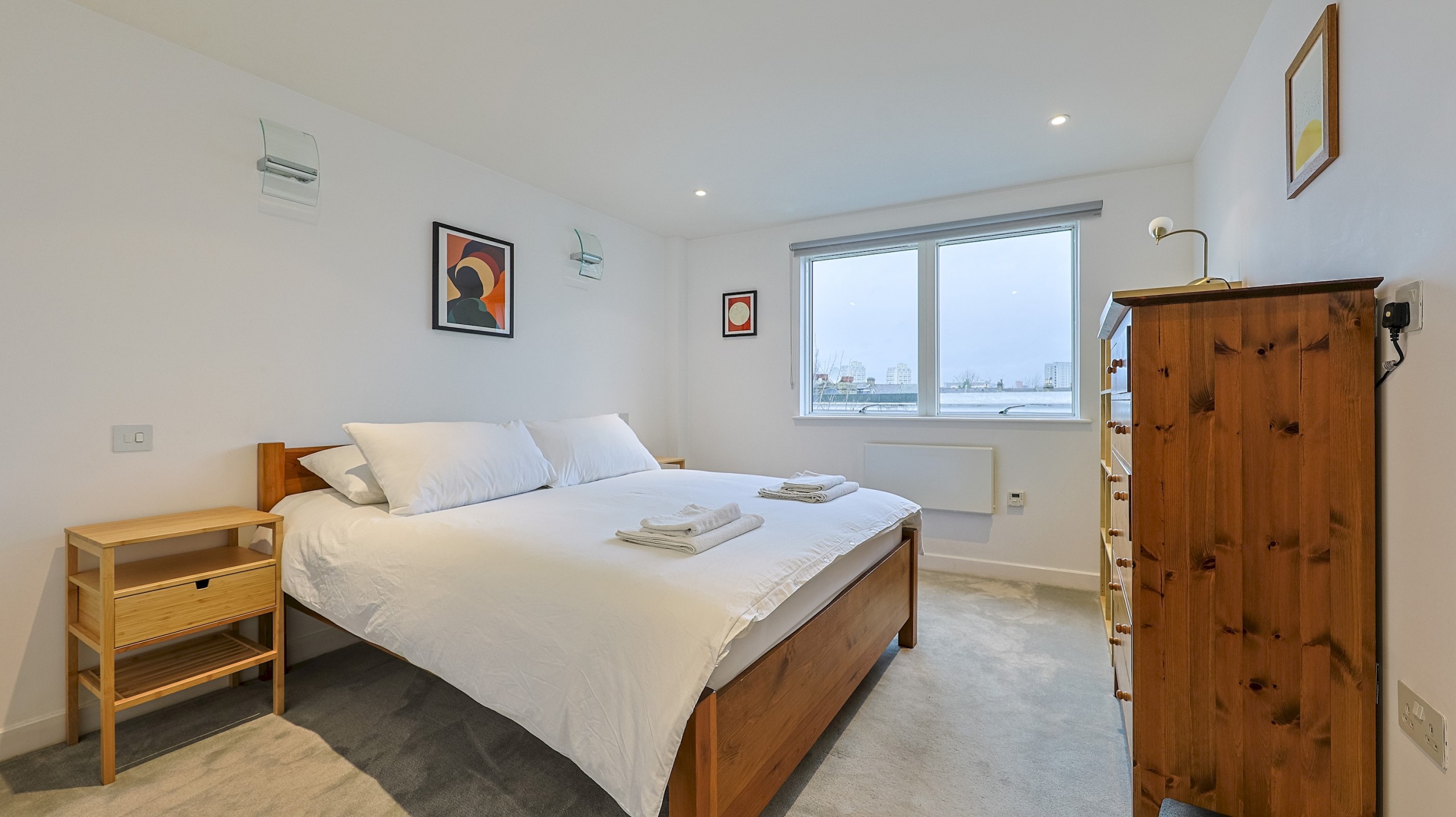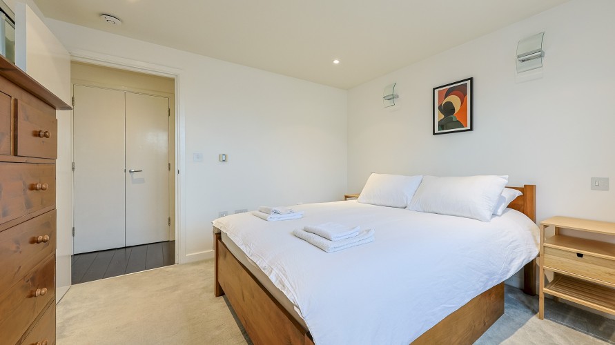 Spacious king-size bedroom with a comfortable mattress, fresh linens, and storage space