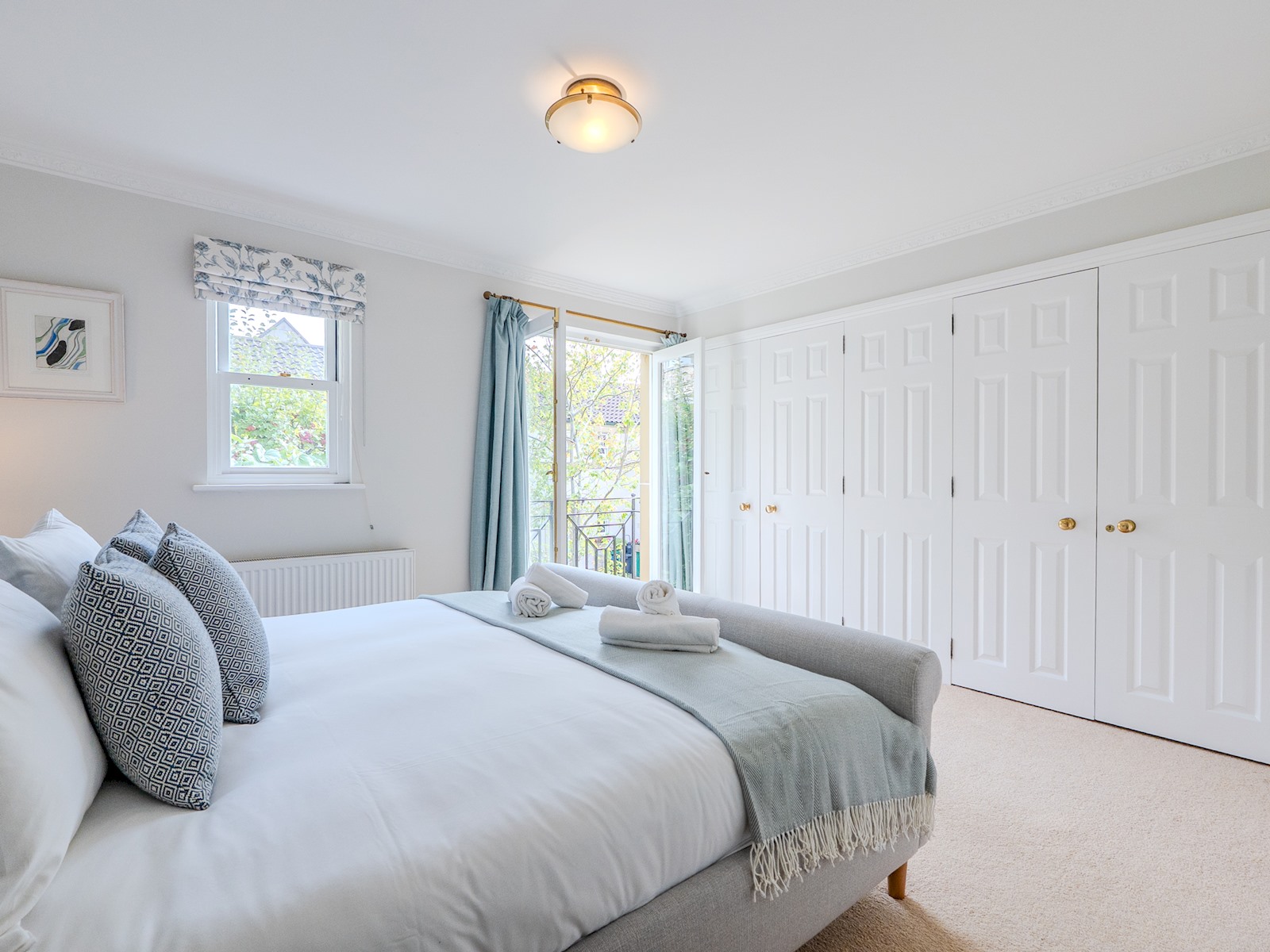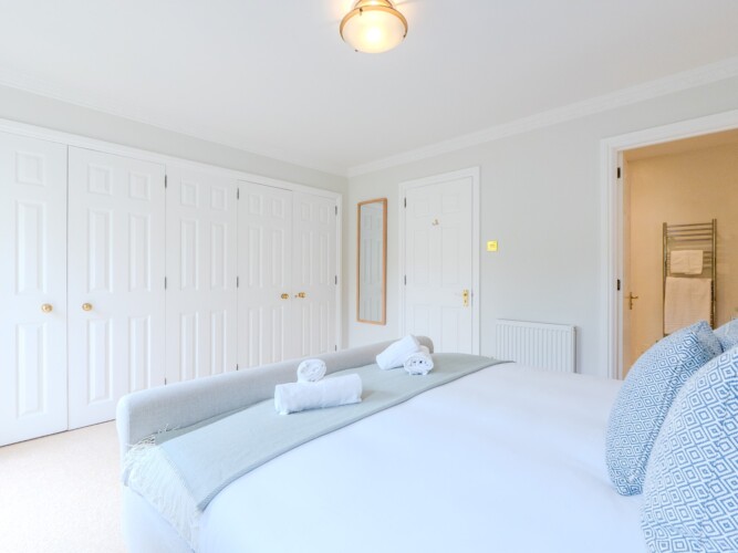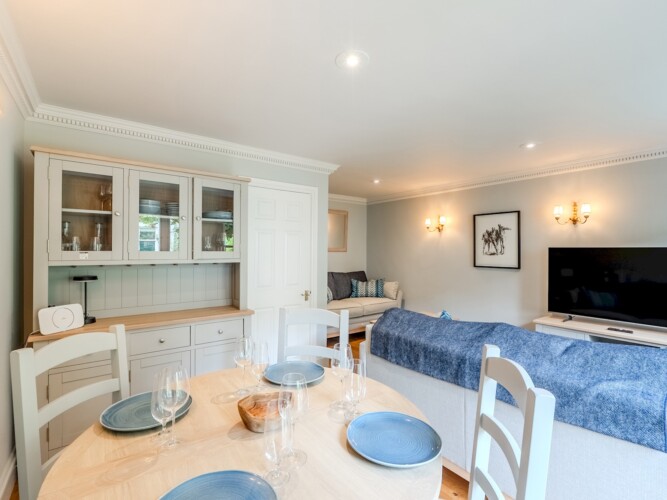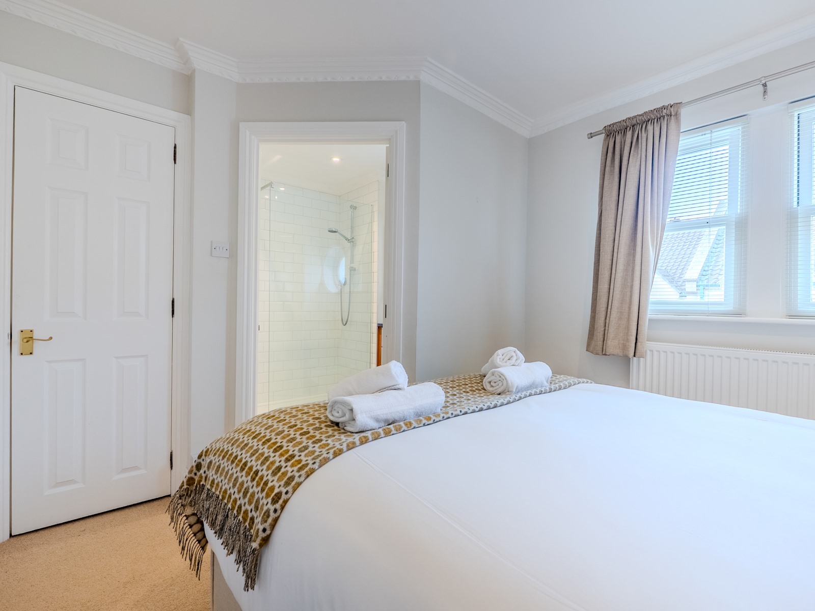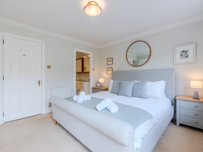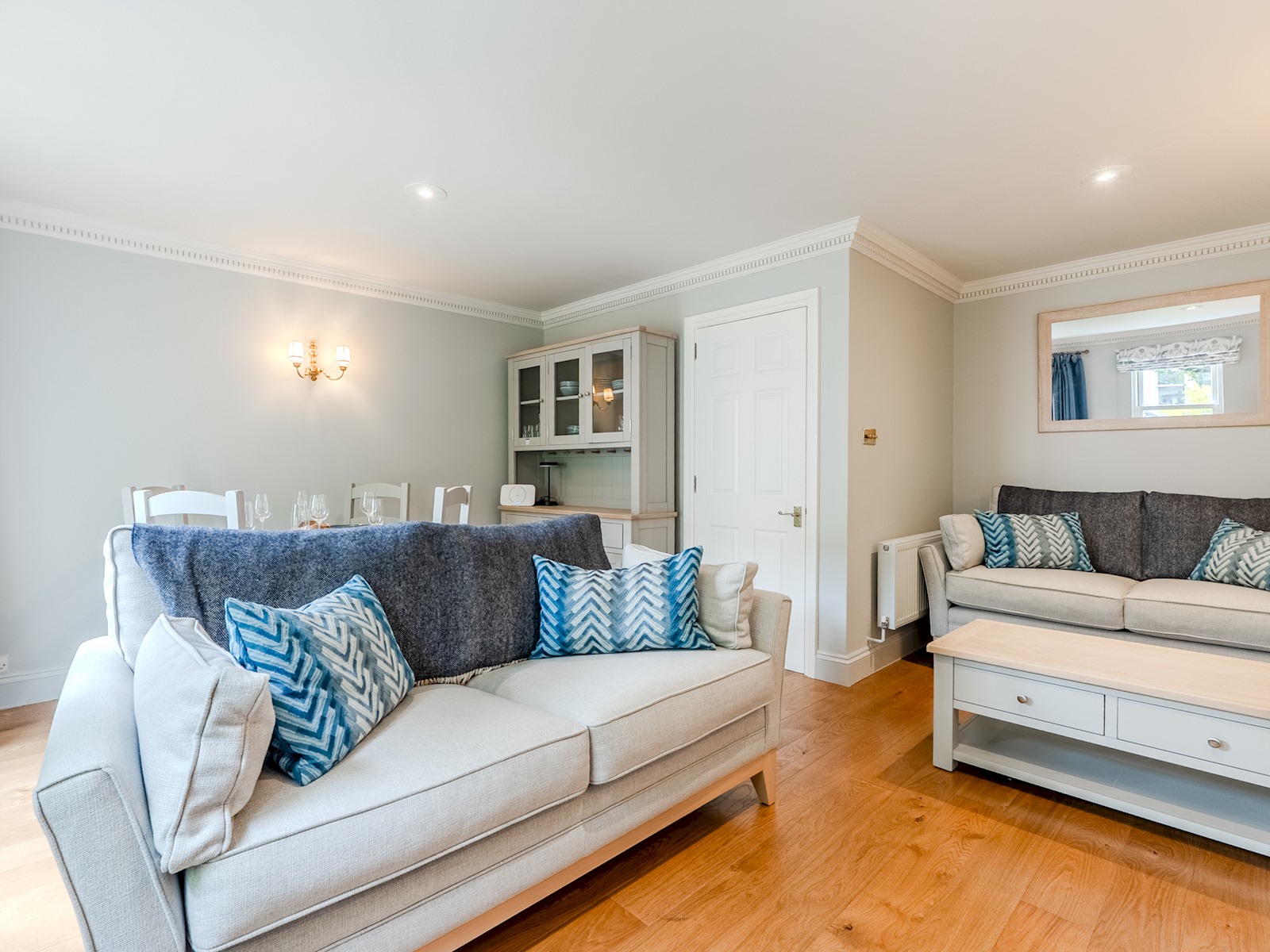 The beautifully presented interior is light and modern, with stylish décor throughout. The spacious living area has comfortable seating and dining space, leading on to a separate fully fitted kitchen. There is also a downstairs cloakroom. Upstairs there is a Super King-size bed room and a king size bedroom both with en-suite shower rooms.