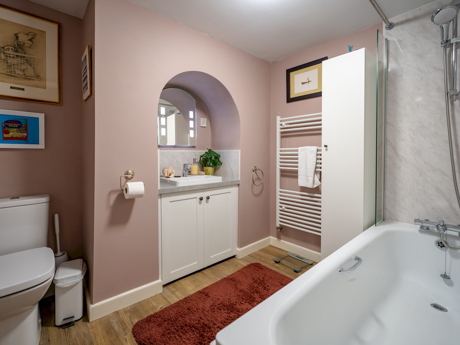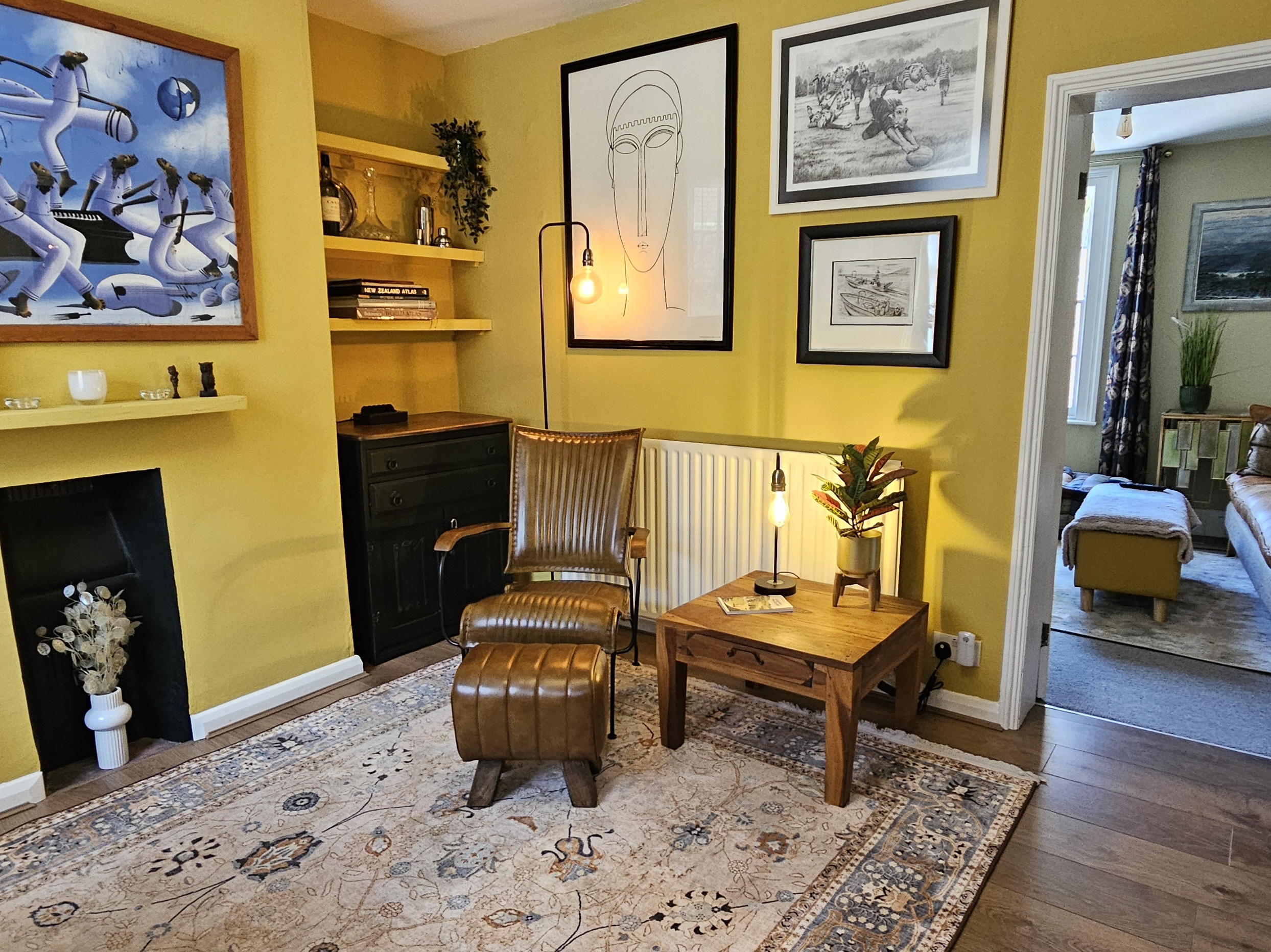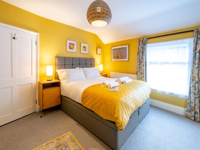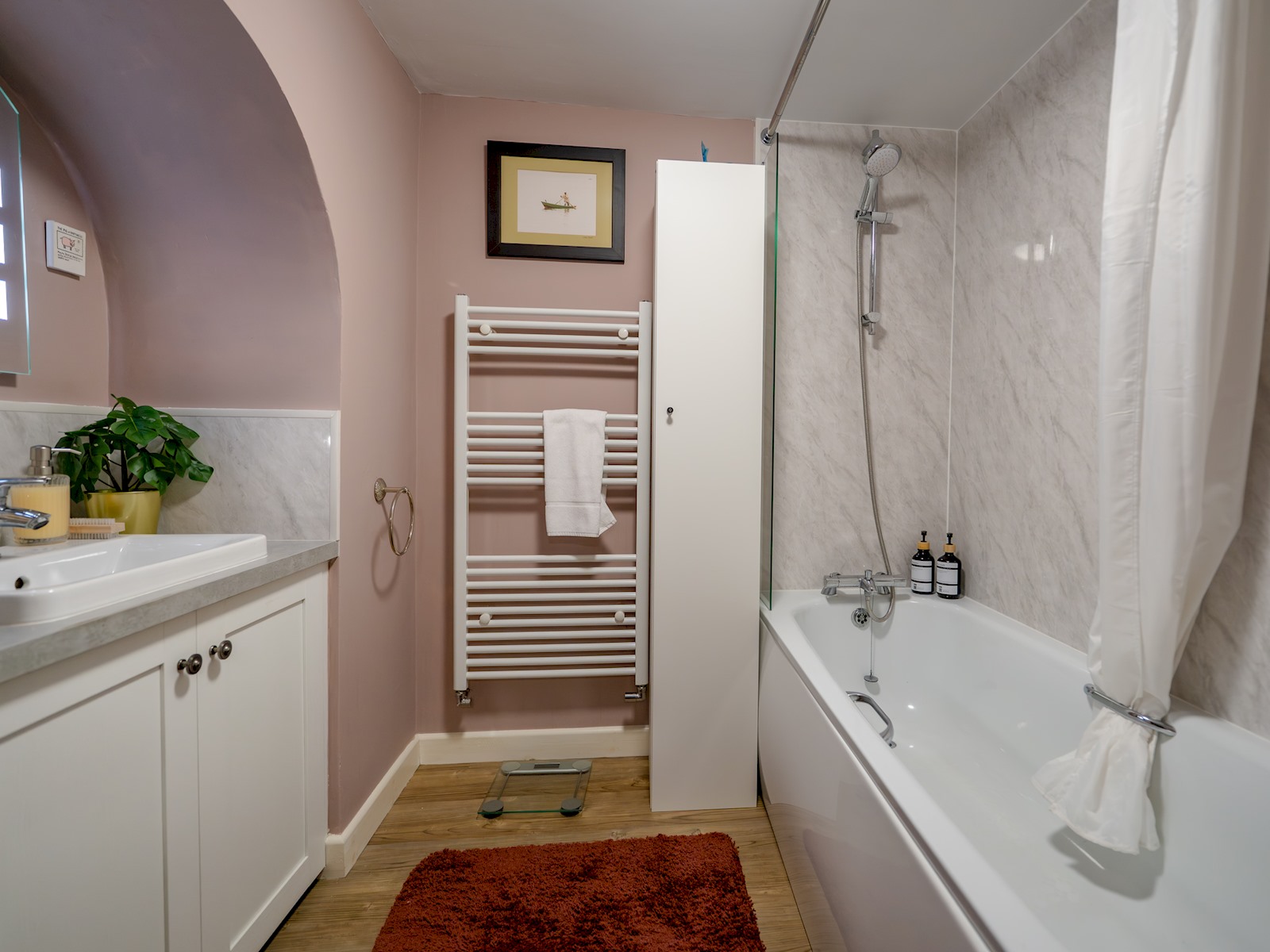 Set over three floors, the house combines character and comfort. On the first floor, you’ll find a cosy sitting room with a Smart TV, perfect for relaxing after a day exploring. Downstairs, there’s a bright kitchen and dining area with all the main appliances you’ll need for your stay. Patio doors lead out to a small garden with outdoor seating, ideal for a morning coffee or evening glass of wine. The main bathroom is also on this level, featuring a bath with shower over.