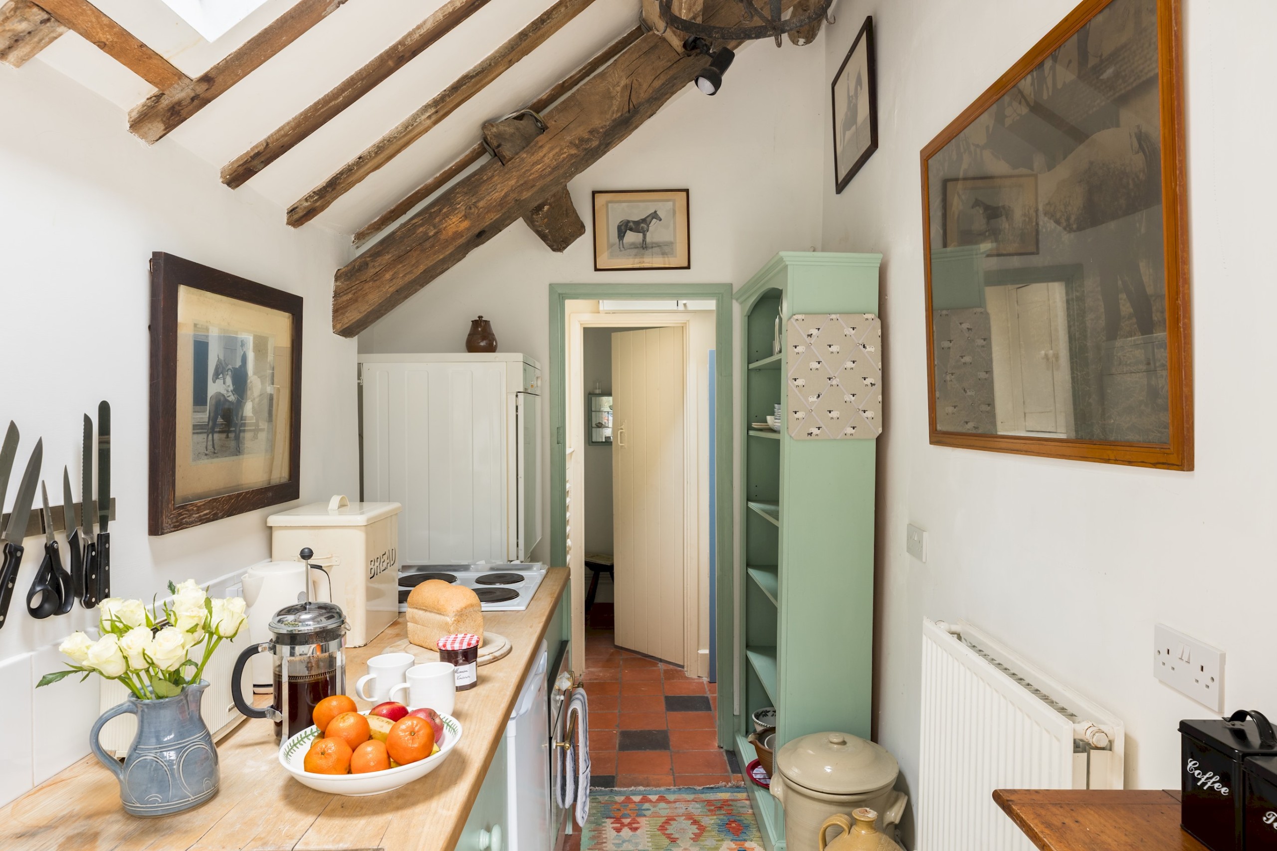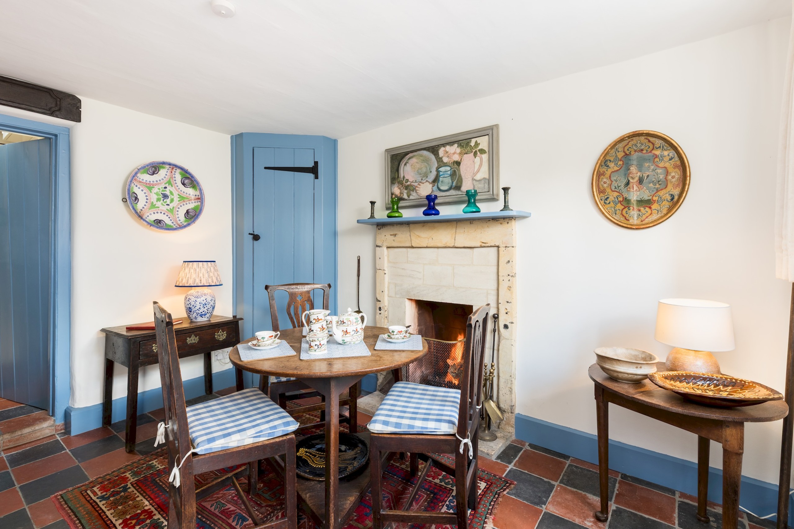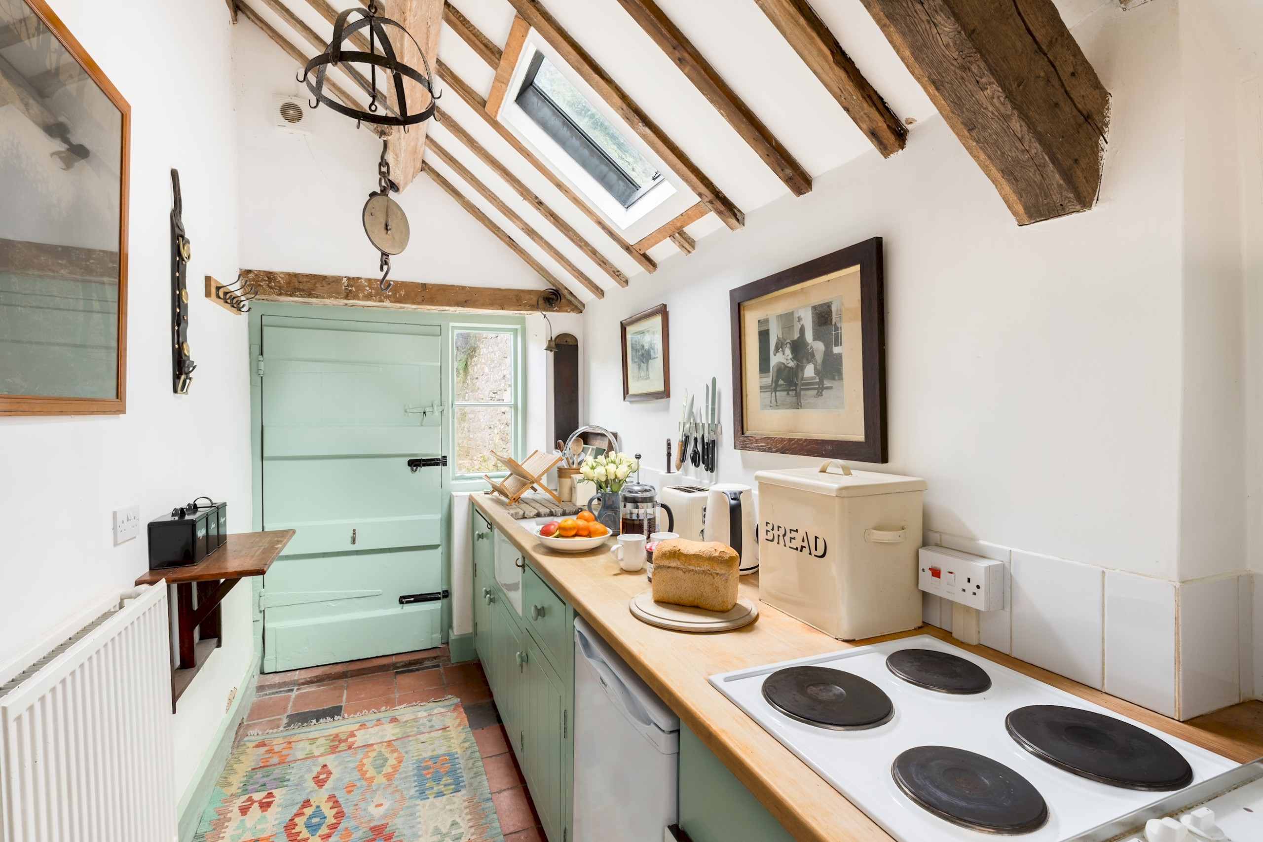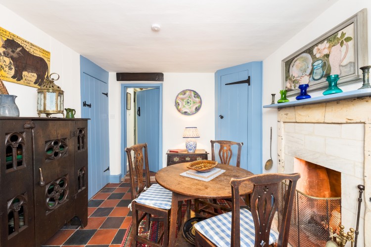 Duck your head as you open the old front door! On your right is a tiny dining room with a fireplace and a little round table. Continue through to the well-equipped galley kitchen to put the kettle on. Make your way back through the dining room around to the cozy sitting room where you can settle into an easy chair to read.