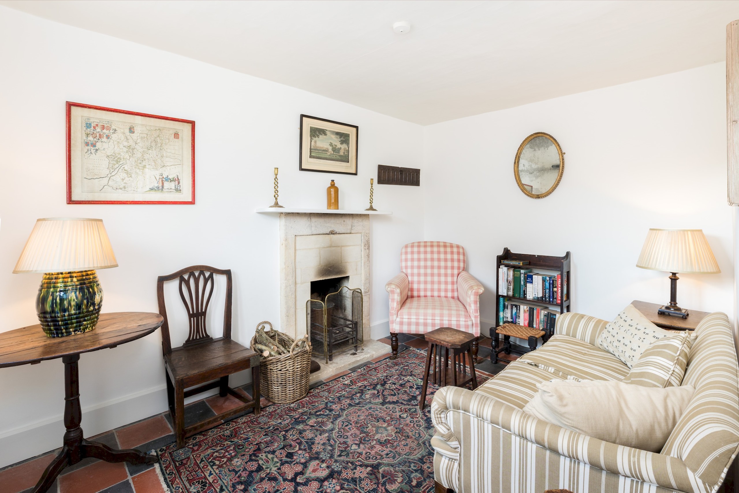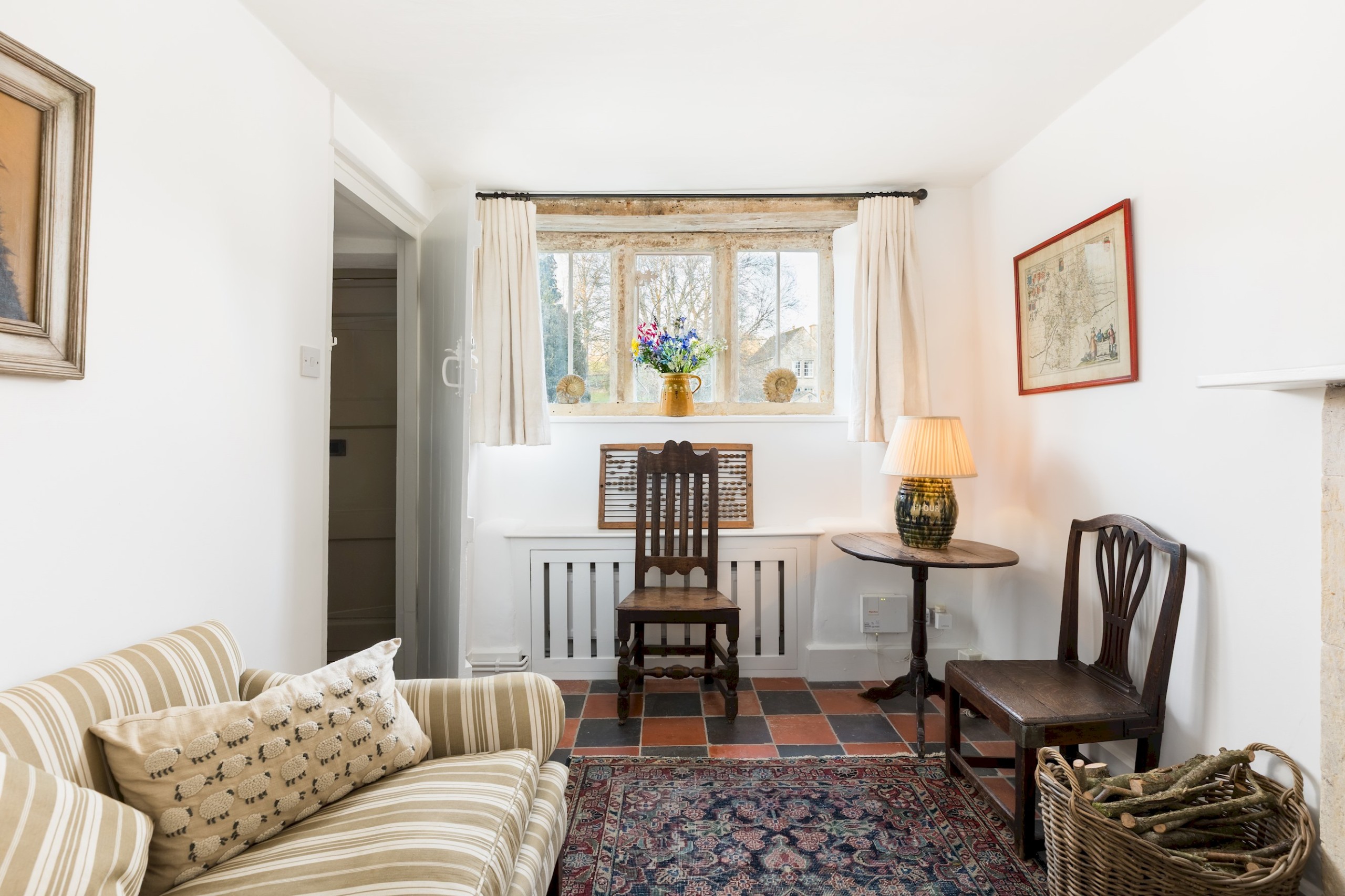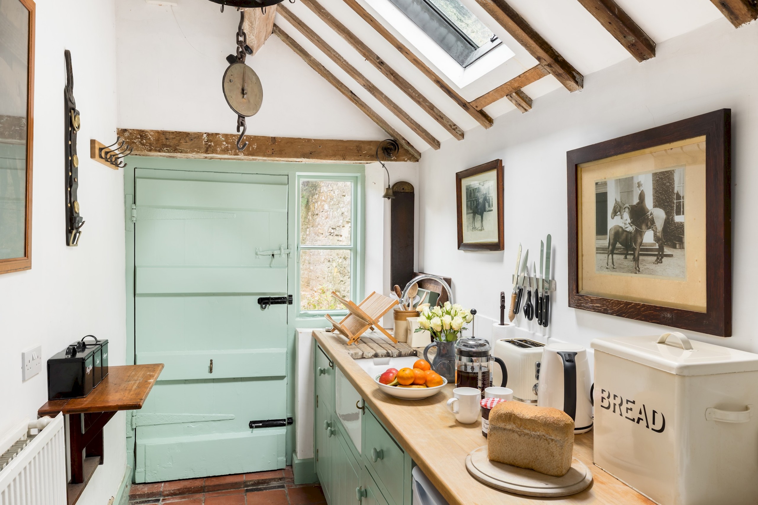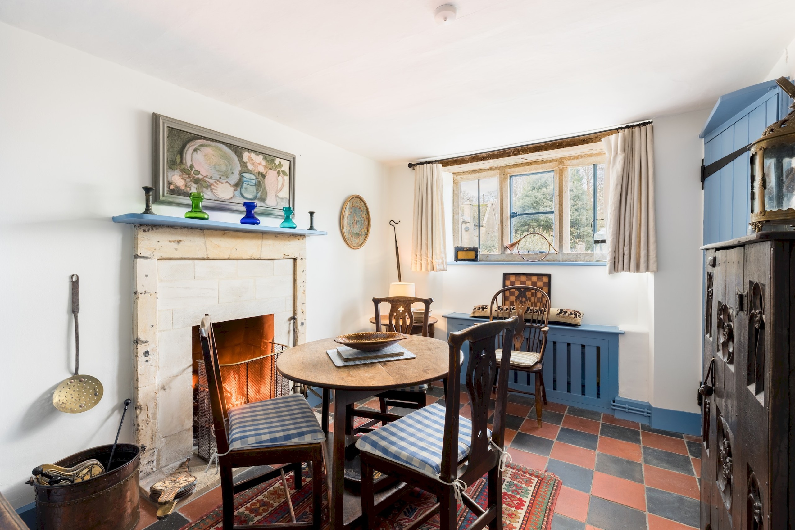 Duck your head as you open the old front door! On your right is a tiny dining room with a fireplace and a little round table. Continue through to the well-equipped galley kitchen to put the kettle on. Make your way back through the dining room around to the cozy sitting room where you can settle into an easy chair to read.
