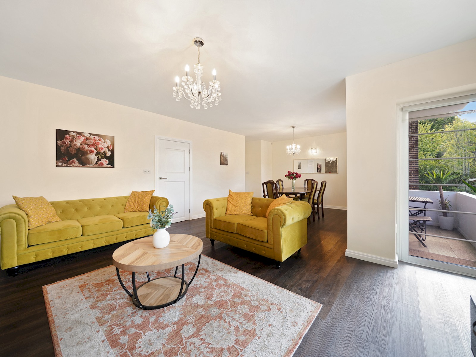 The flat has a spacious and bright living-dining area and small balcony overlooking communal gardens. There are 3 good sized bedrooms, 2 with an ensuite and a family bathroom. This flat has a large fully equipped kitchen.