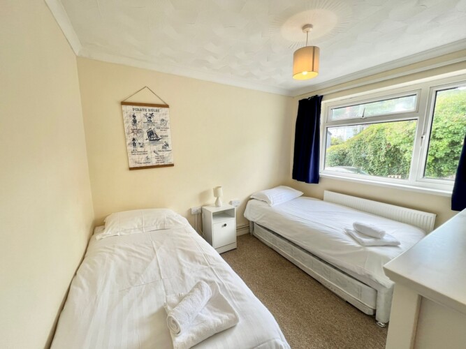 Second Bedroom: The second bedroom offers two comfortable single beds, perfect for children or additional guests. This bright and airy room is lovingly decorated, providing a cozy space to relax and recharge, with views of the garden.