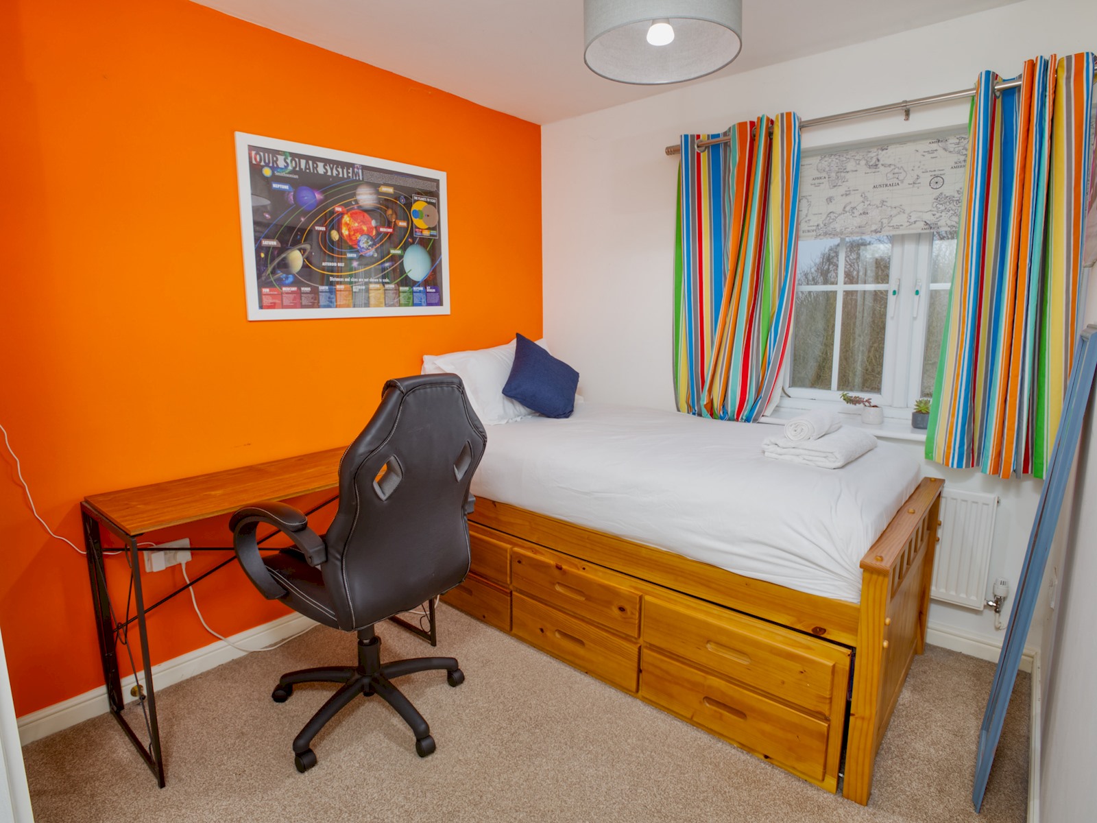 This spacious home features a bright, open living area with a cosy dining space. The fully equipped kitchen offers modern appliances for easy meal prep. Each bedroom is comfortably furnished with ample storage and has a dedicated workspace. There is a private yard perfect for relaxation. With a family-friendly layout, it’s ideal for both short and long-term stays.