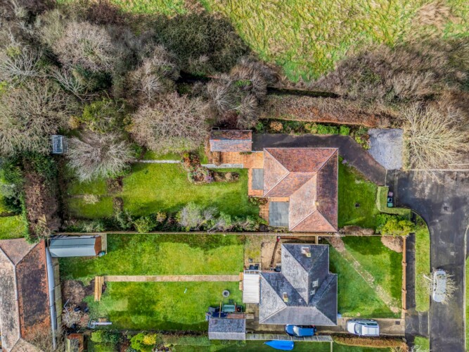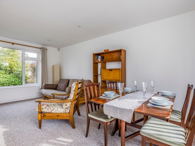 At the end of the corridor, the inviting sitting room awaits, furnished with a comfortable futon sofa and an armchair—ideal for a cosy evening in front of the 50-inch Smart TV (please use your own streaming logins). The adjoining dining area seats four and offers lovely views of the garden, with a back door providing easy outdoor access.