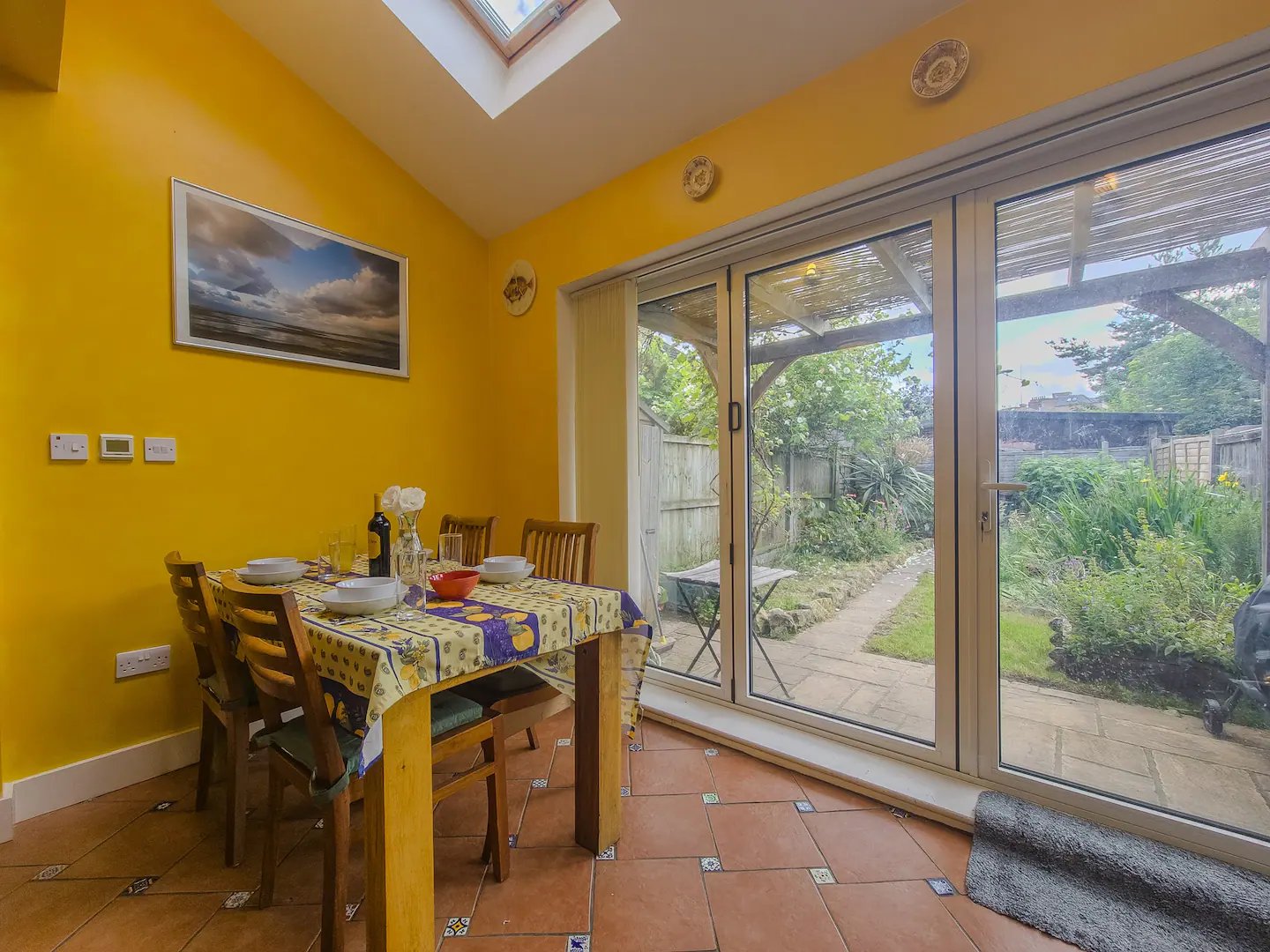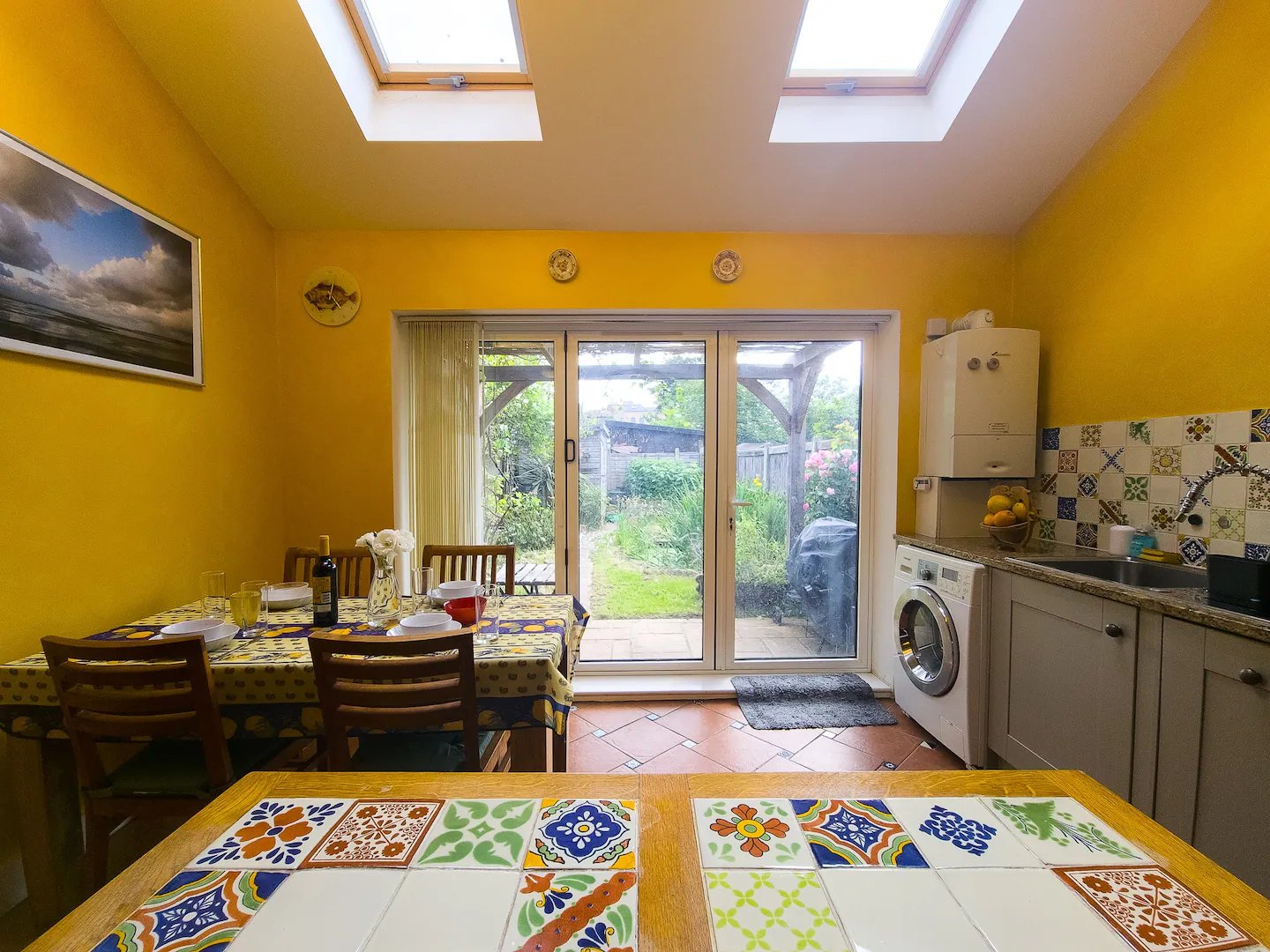 The entrance hallway leads to a cozy living room with a DVD player and a selection of DVDs and books for guests. The vibrant kitchen, decorated with colourful tiles, is equipped with modern appliances including an IH stove, washing machine, microwave, and oven. The dining area opens directly onto the garden, perfect for enjoying meals with a view.
