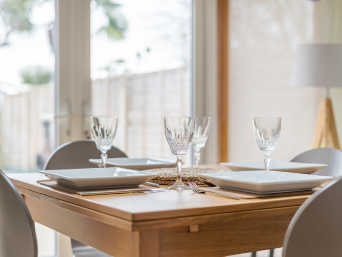 The living room provides a cozy space to unwind and catch up, while the open-plan kitchen features a small dining table for four. As you prepare your meals, enjoy a view of the deck area and watch the world go by.